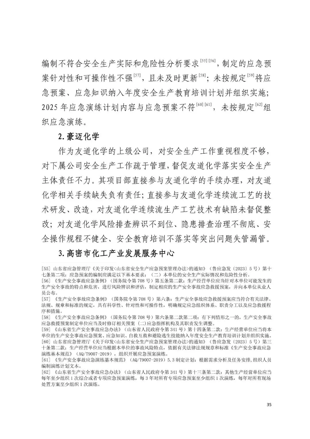 3.郑浩,群众,友道化学技术科主管。对事故发生负有责任。因涉嫌重大责任事故罪,2025年6月19日被高密市公安局采取刑事强制措施。建议由司法机关依法追究其刑事责任。