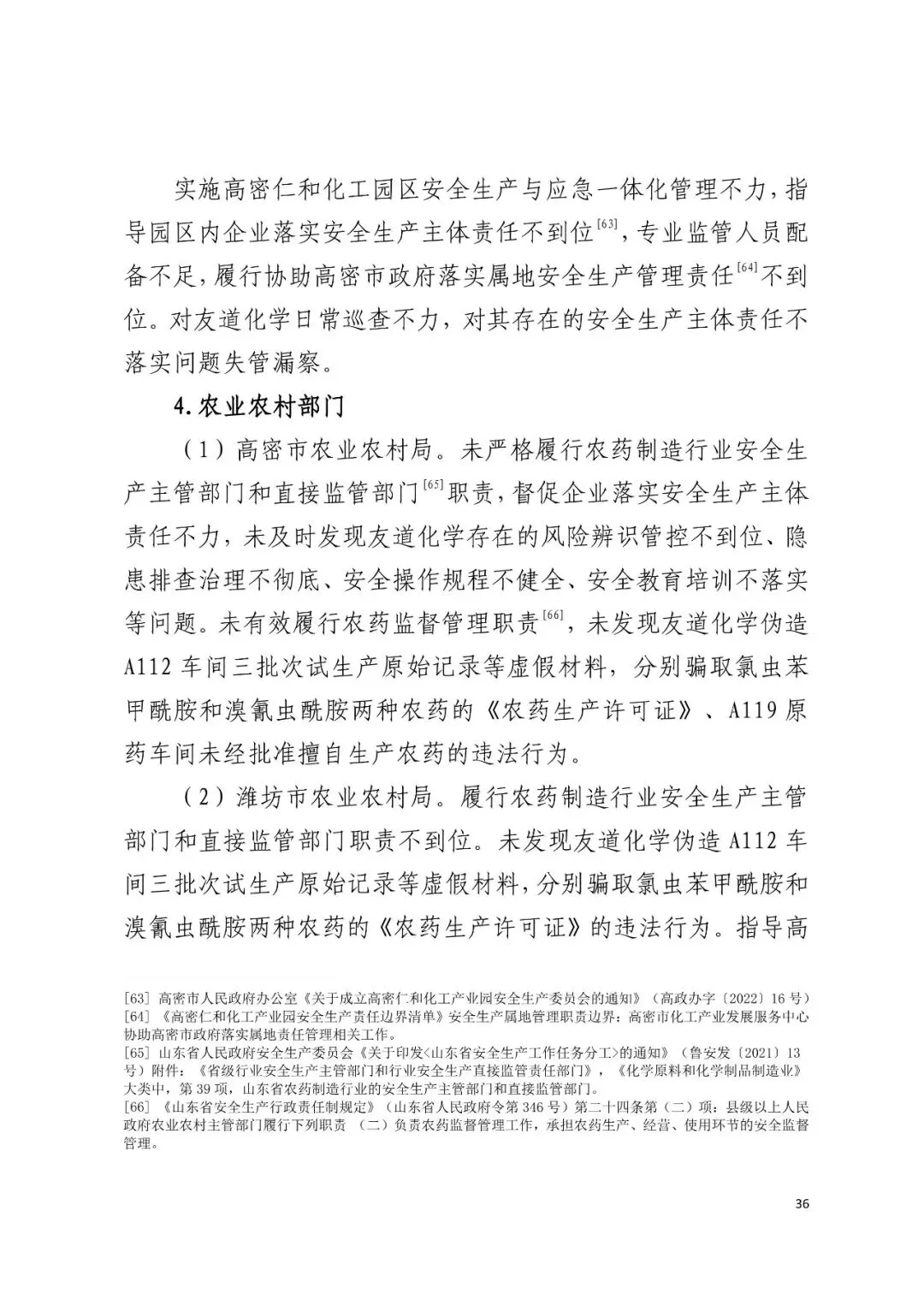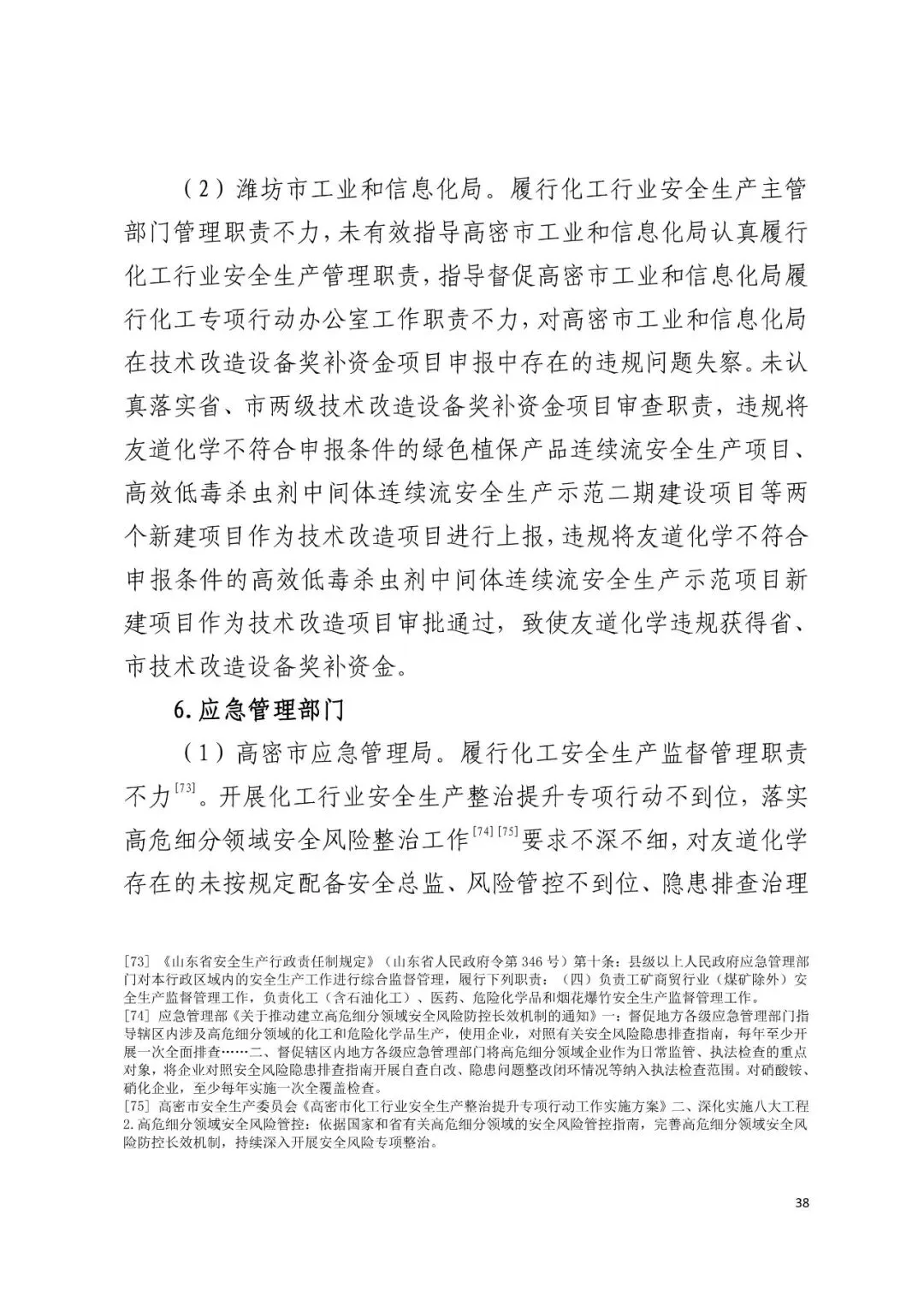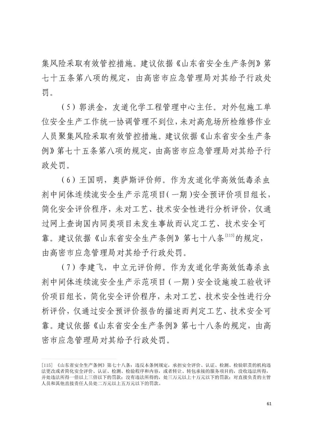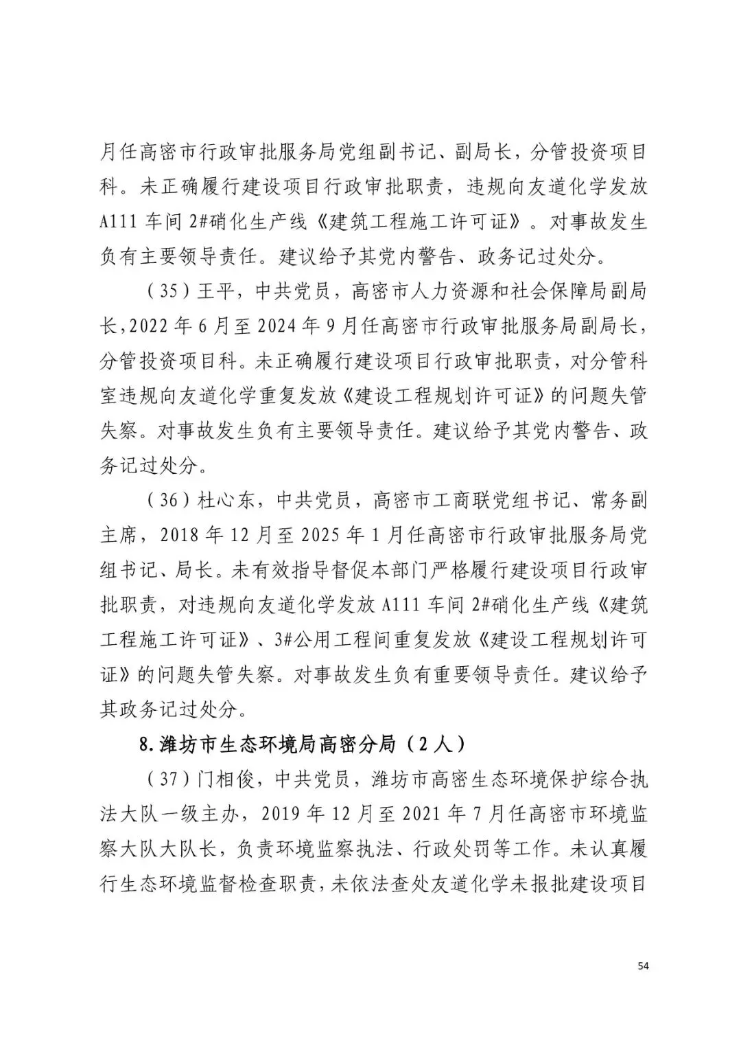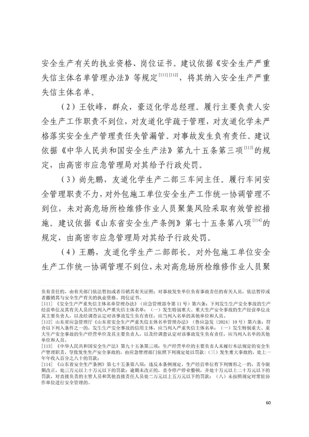 4.张鲁祥,群众,友道化学安全科主管。对事故发生负有责任。因涉嫌重大责任事故罪,2025年6月19日被高密市公安局采取刑事强制措施。建议由司法机关依法追究其刑事责任。