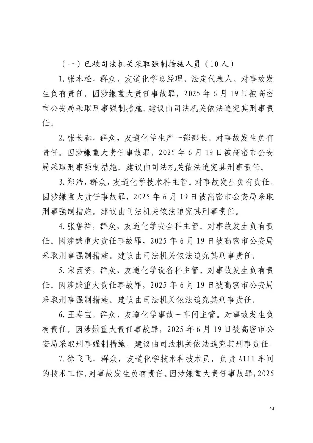 1.张本松,群众,友道化学总经理、法定代表人。对事故发生负有责任。因涉嫌重大责任事故罪,2025年6月19日被高密市公安局采取刑事强制措施。建议由司法机关依法追究其刑事责任。