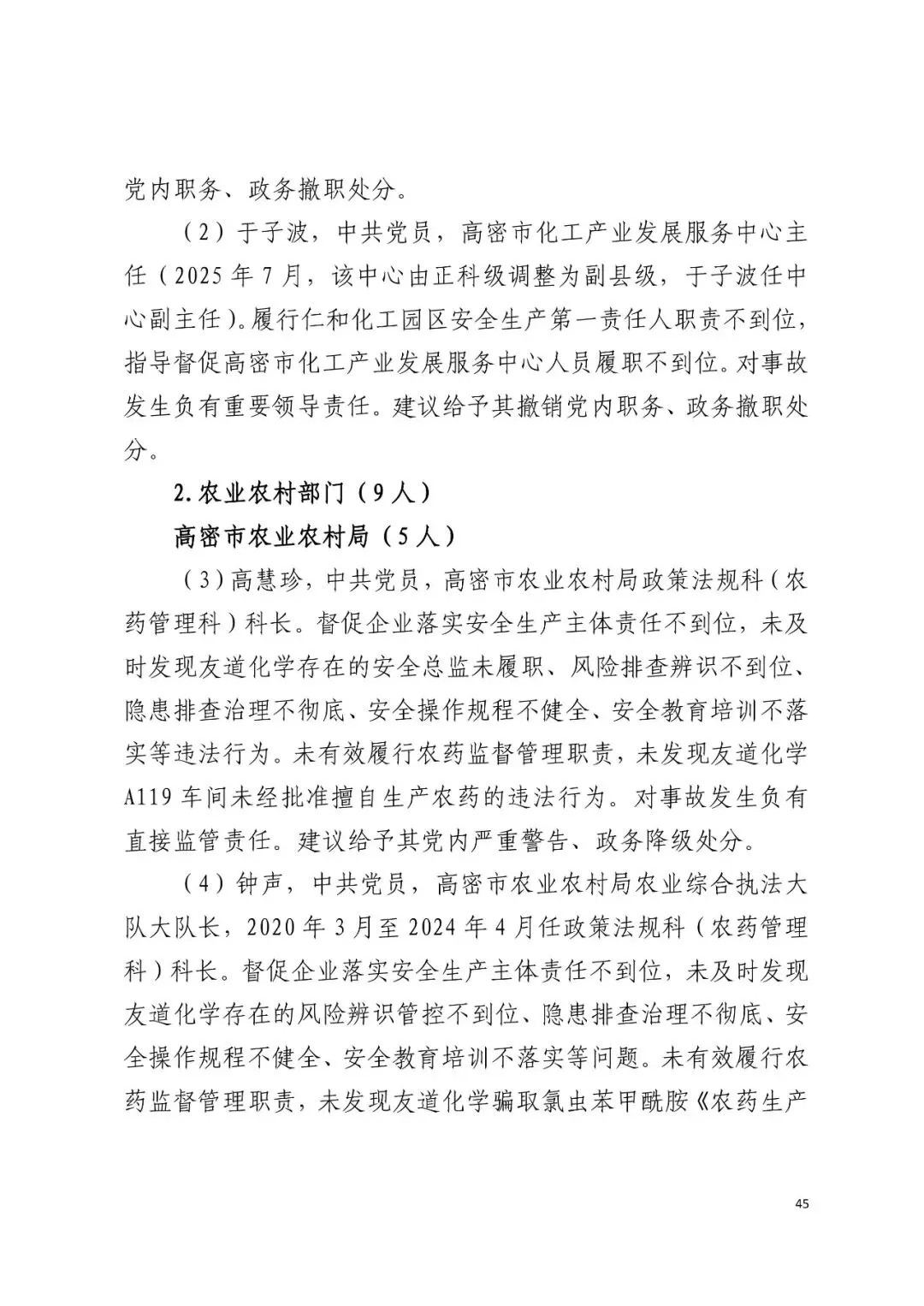 2.于子波,中共党员,高密市化工产业发展服务中心主任(2025年7月,该中心由正科级调整为副县级,于子波任中心副主任)。建议给予其撤销党内职务、政务撤职处分。