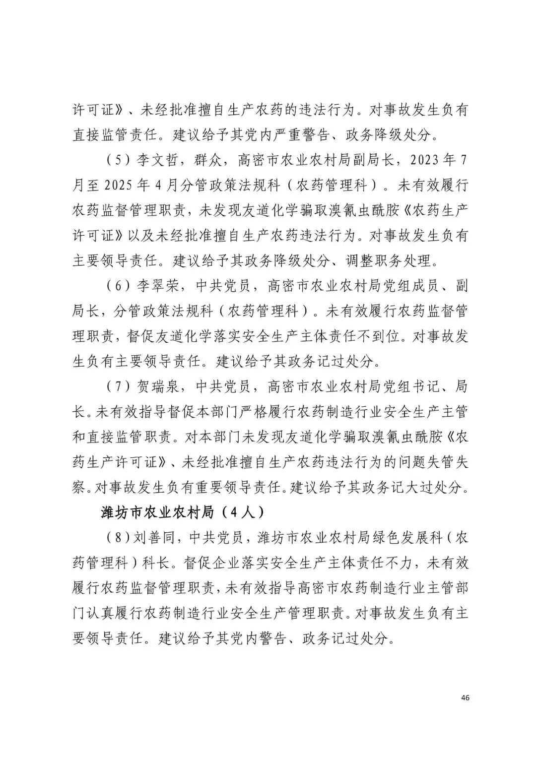 3.高慧珍,中共党员,高密市农业农村局政策法规科(农药管理科)科长。建议给予其党内严重警告、政务降级处分。