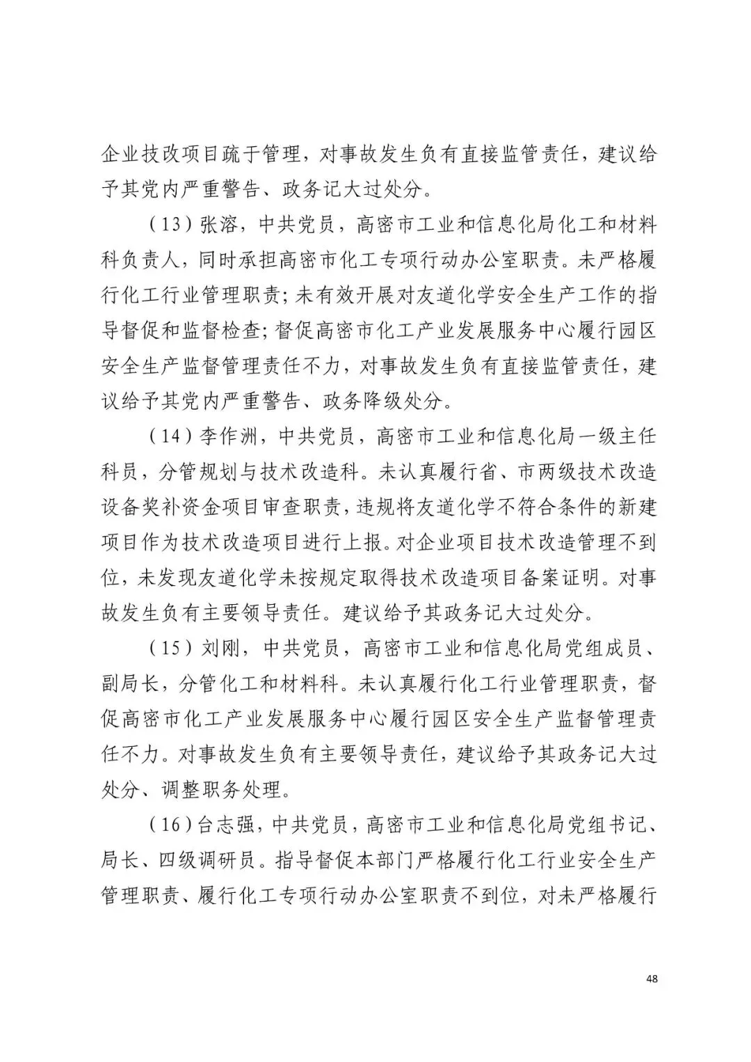 13.张溶,中共党员,高密市工业和信息化局化工和材料科负责人。建议给予其党内严重警告、政务降级处分。