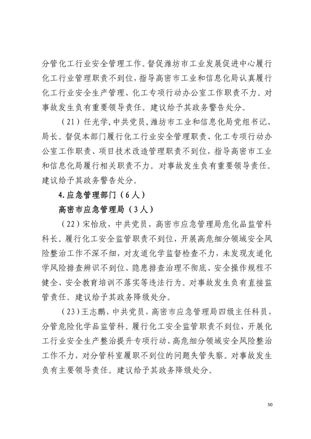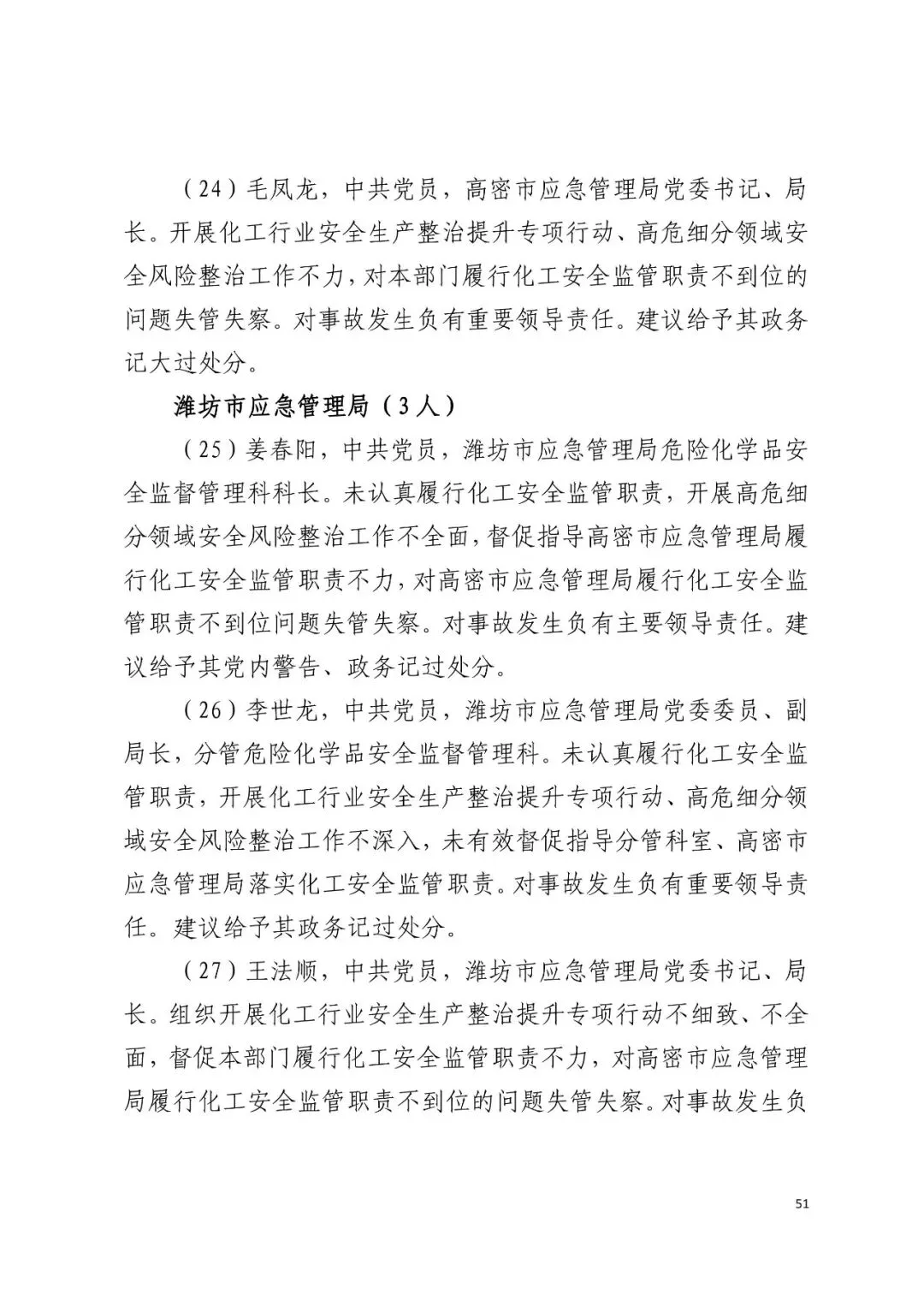 25.姜春阳,中共党员,潍坊市应急管理局危险化学品安全监督管理科科长。建议给予其党内警告、政务记过处分。