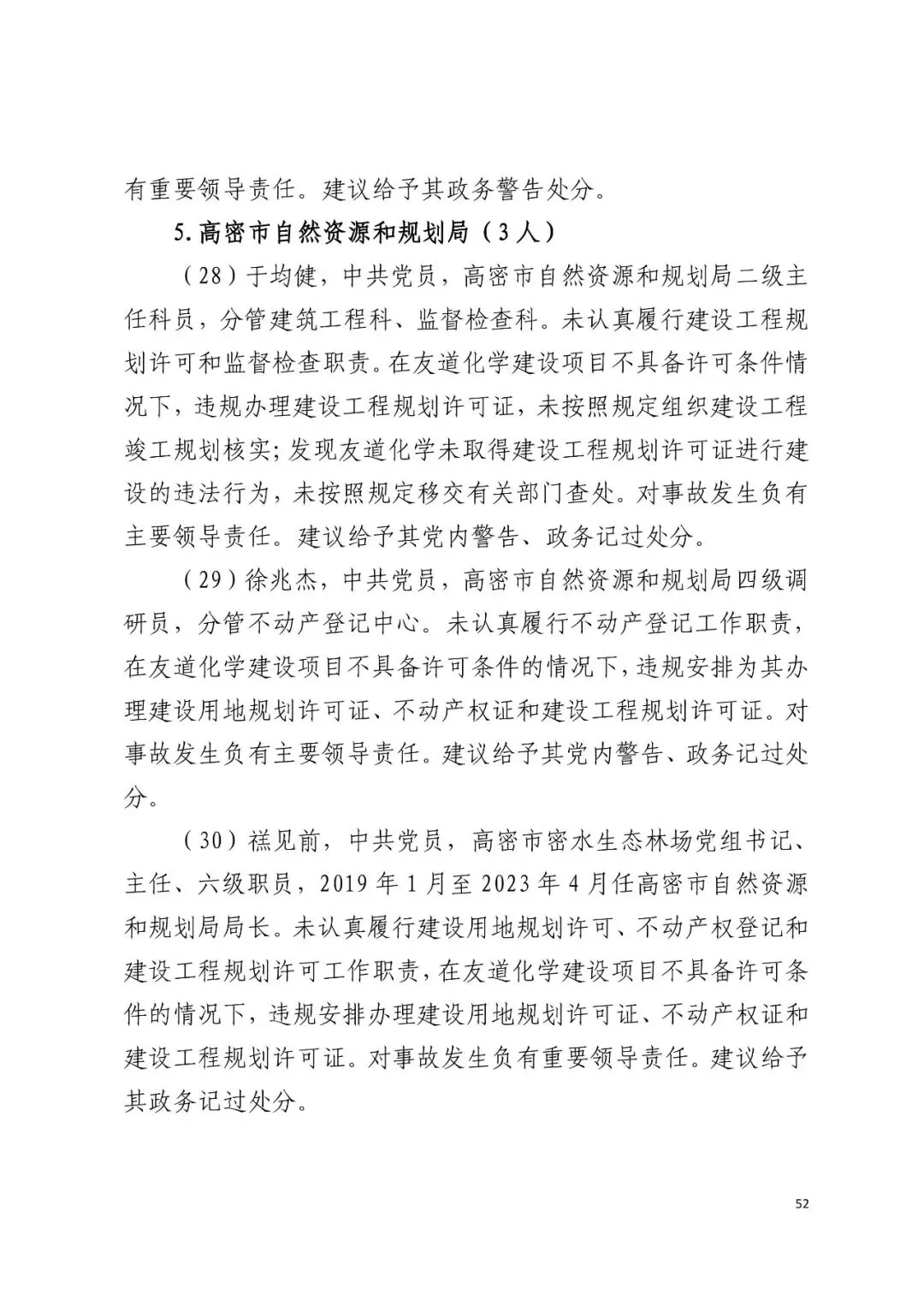 29.徐兆杰,中共党员,高密市自然资源和规划局四级调研员。建议给予其党内警告、政务记过处分。