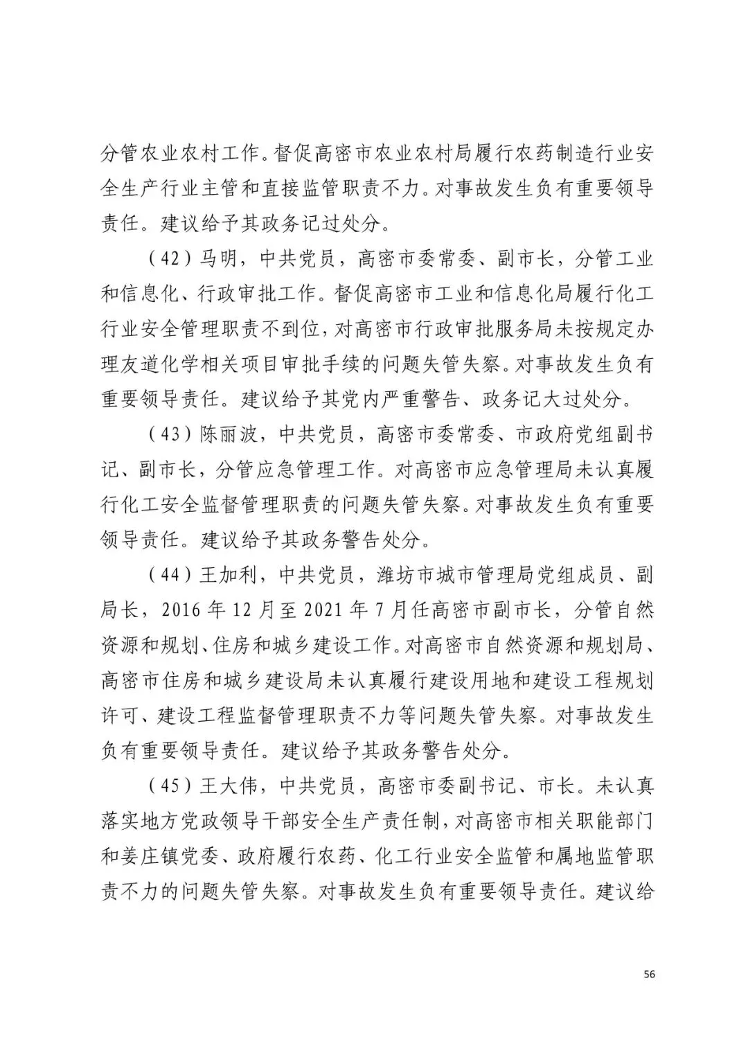 45.王大伟,中共党员,高密市委副书记、市长。建议给予其党内警告处分。