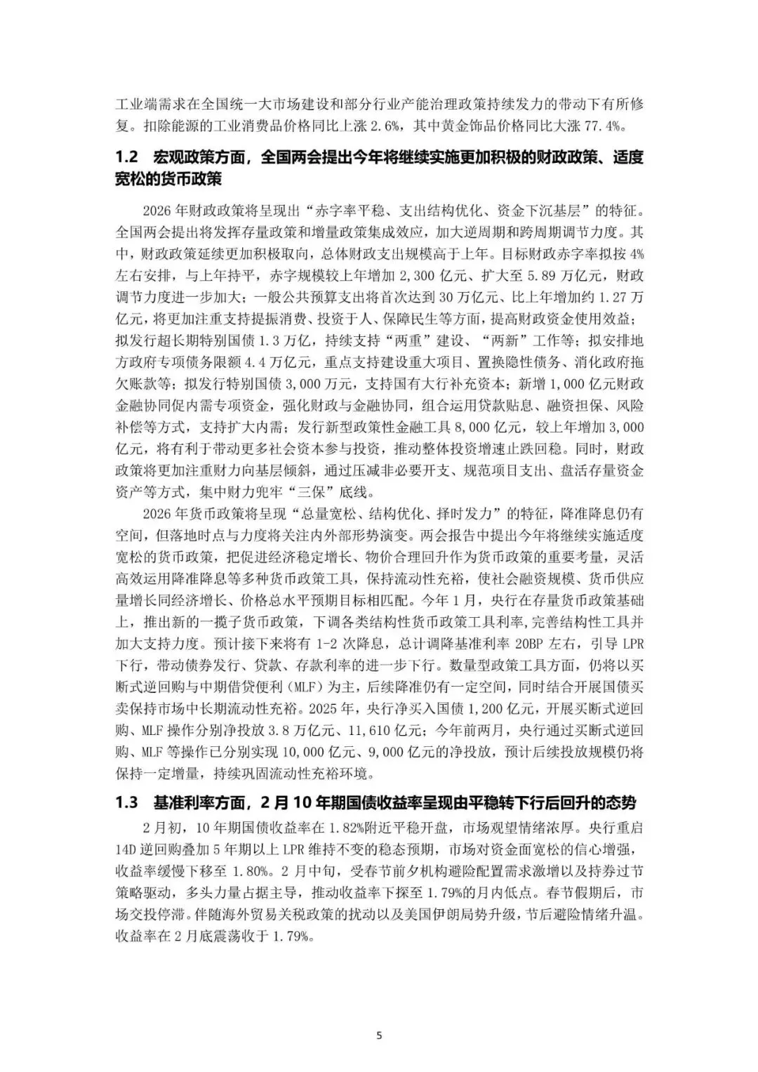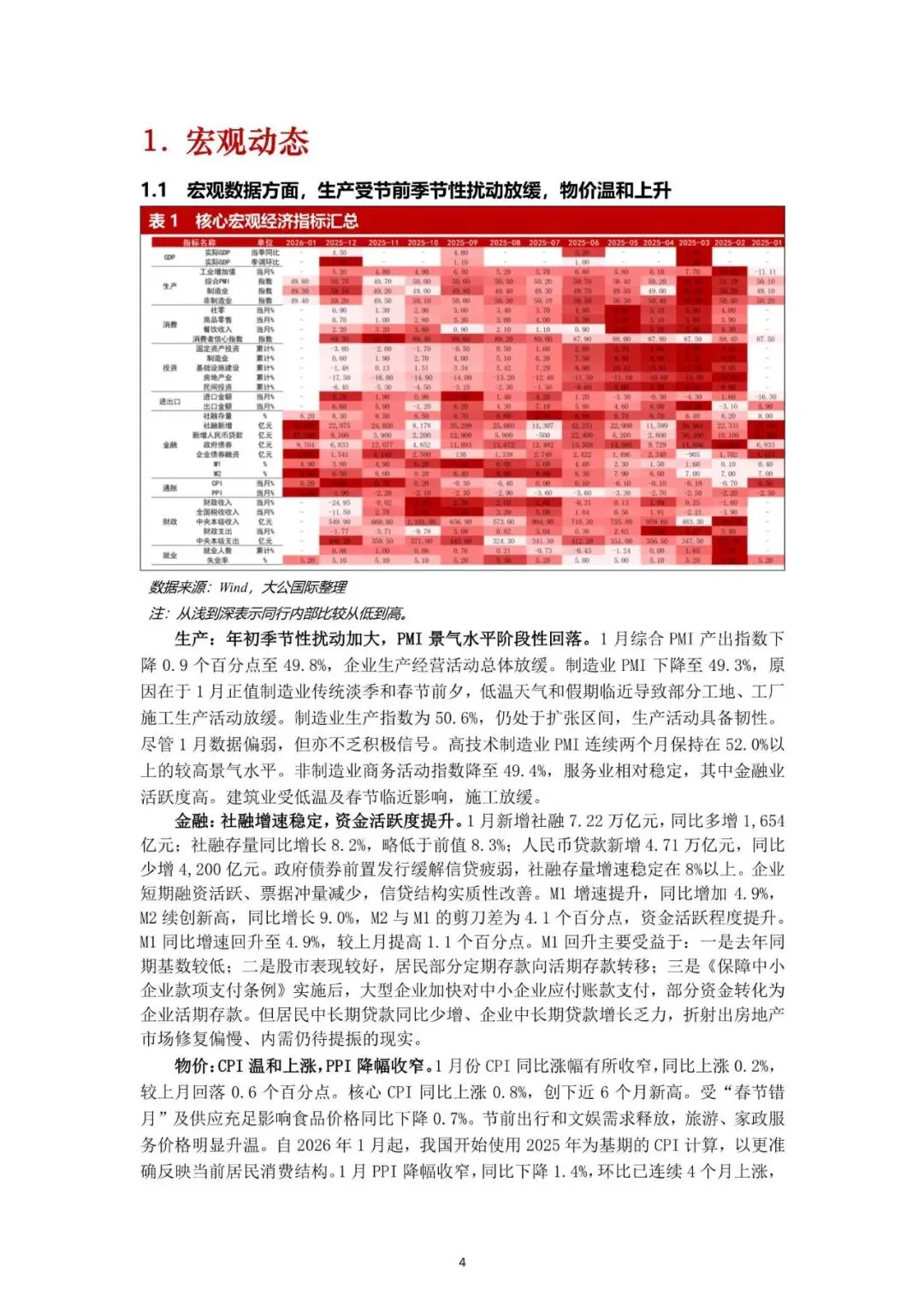 宏观数据:1 月宏观经济呈现生产端季节性放缓与金融物价端持续回升的特征。受春节错位及低温天气扰动,制造业 PMI 回落至 49.3%,但高技术制造业与生产指数仍具韧性;核心 CPI 创六个月新高且 PPI 环比连续四月上涨,内生动能与工业需求持续修复。