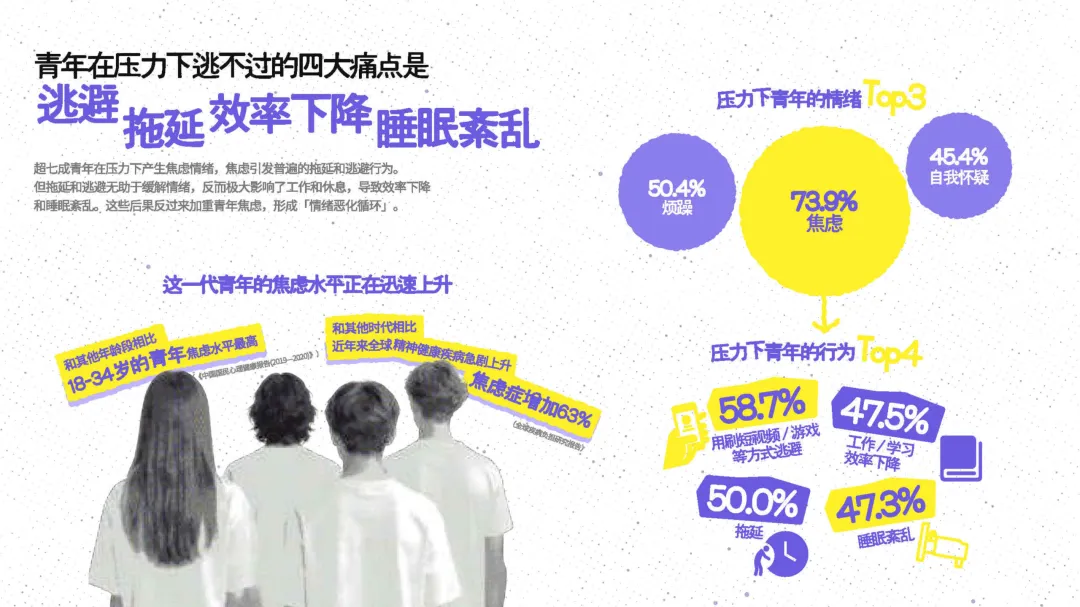 同辈压力 > 就业压力,成为重要困扰源 原生家庭:22-28 岁影响达峰值,父母期待与干预牵动情绪 数字媒介: 超半数青年用刷短视频 / 打游戏应对情绪,常陷入更强负面情绪 减少运动、社交和睡眠时间,强化社会比较,引发自我指责