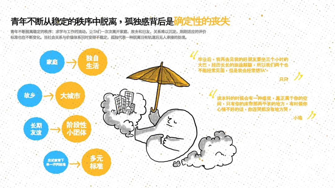 长时间独处 + 高度竞争:独生子女、商品房、互联网塑造的生存环境 时间加速:升学就业压力提前,成长机会却延后,焦虑源于时间失控 确定性丧失:关系与价值体系双重不稳定,孤独成为 “无人承接” 的悬浮感 环境影响因素