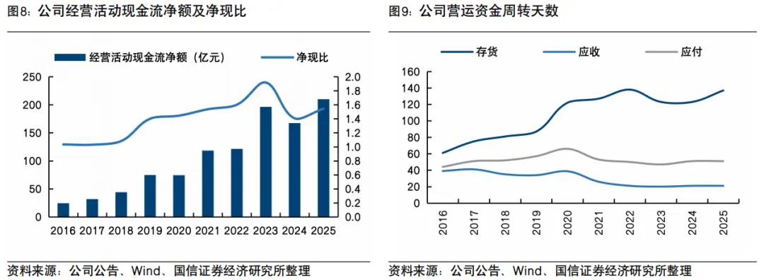 营运资金周转保持基本稳定,维持50%以上派息率并增加股份回购。存货周转天数增加14天至137天,主因2024年底存货基数较大所致。应收账款天数和应付账款天数均保持稳定,分别为21天和51天。2025年公司经营性现金流入净额为210.0亿元,净现比1.5,净现金317.2亿元。2025年派息率为50.1%,并于年内购回约港币16.8亿元的股份。