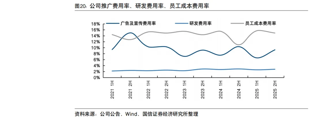 毛利率方面,公司2025年为62.0%,较2024年的62.2%下降了0.2个百分点,主要由于毛利率较低的电子商贸业务占比持续增加等原因。分品牌看: