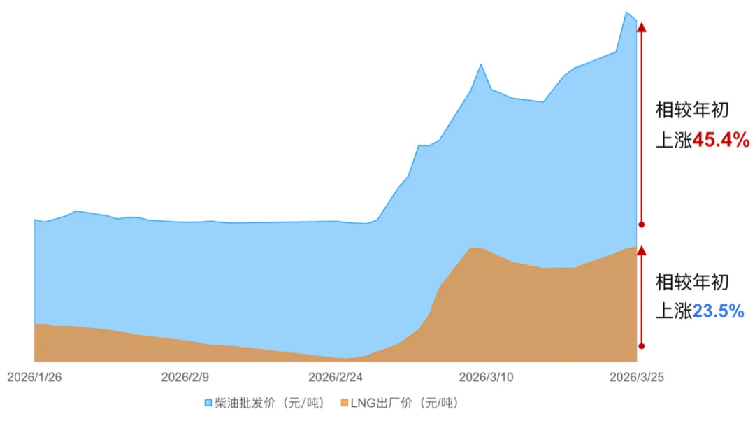 2026年2-3月柴油批发价与LNG批发价价差扩大: