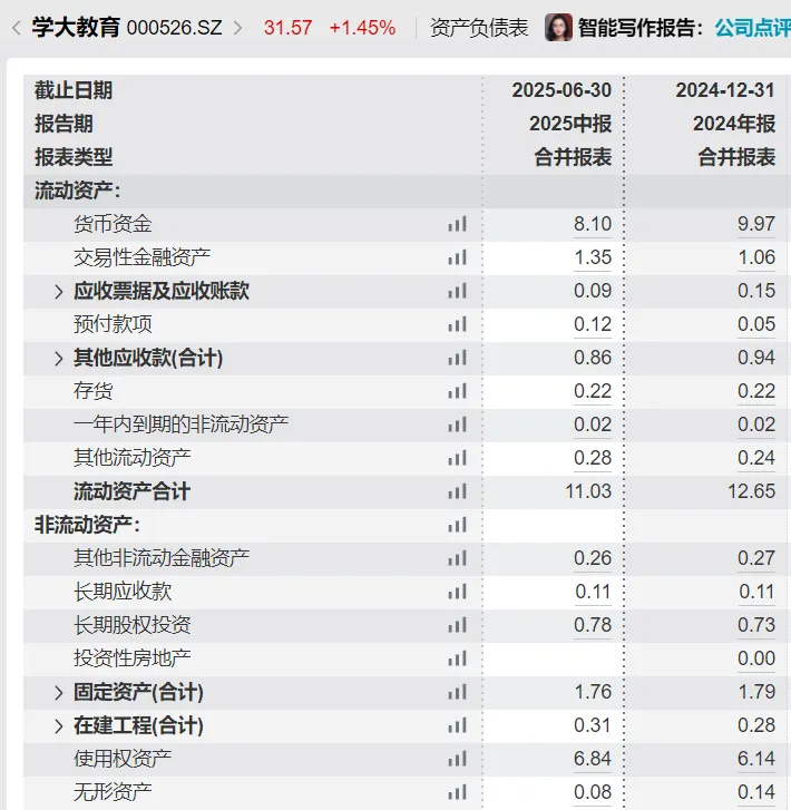 学大教育是一家轻资产公司,扣除商誉后的非流动资产为13亿,其中一半是使用权资产,应该就是土地使用权,像固定资产、在建工程合计只有2亿。而它的非流动资产有11亿,其中9.4亿是货币和金融资产,应收款非常少。这种情况,应该与张雪峰公司的差不多了。