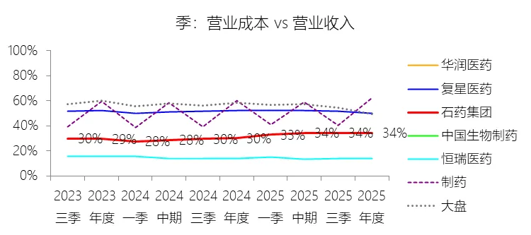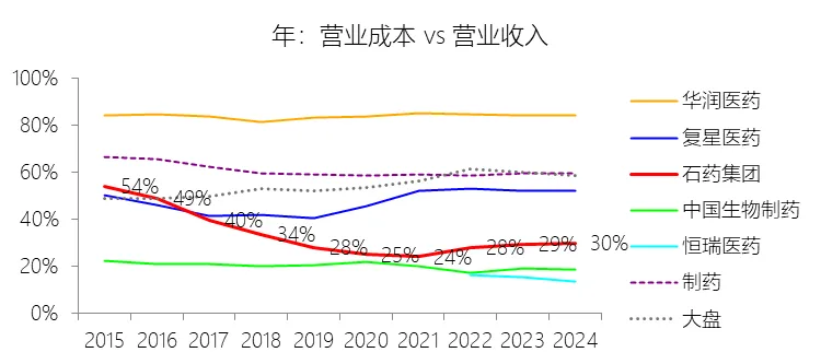 营业成本:2025年,石药集团的营业成本为89.47亿元,同比增长2.72%,与营业收入的比例为34.41%(营业成本率,即1-毛利率),同比上升4.38个百分点;2015-2024年(十年),此项合计为675.30亿元,平均比例为31.04%,比制药行业的均值低29.29个百分点,长期呈下降趋势。比例短期上升主要由于石药集团核心成药产品多美素®及津优力®被纳入京津冀“3+N”等联盟药品的集中带量采购,中标价大幅下调(如津优力下调约58%,多美素下调约23%),且主力创新药恩必普®受国家医保谈判降价影响,导致在营业成本小幅增长的情况下,由于产品大幅降价引致的营业收入下滑(同比减少10.35%)产生了强烈的比例效应。同时,2025年内维生素C原料产品销售价格的持续下降也进一步挤压了该板块的毛利空间,共同推高了整体营业成本率。比例长期下降主要由于集团自2012年起坚定实施由普药和原料药向创新药转型的战略,高毛利率的创新药业务收入占比从2015年的33.1%稳步提升至近年来的约60%,显著优化了集团的利润结构。此外,集团在原料药和普药领域持续通过技术升级、节能降耗以及生产工艺的不断改进来降低生产成本,并在维生素C等市场波动中灵活调整经营策略,确保了长期经营效率的提升。比例低于制药行业的均值主要由于石药集团拥有行业内显著的“原料药+制剂”全产业链管控优势,通过垂直整合降低了对外部原材料供应的依赖及采购成本,形成了突出的低成本护城河。同时,集团凭借在维生素C、咖啡因等领域的全球领先产能规模实现的规模效应,以及成功孵化出的恩必普®、多恩达®(全球首个上市的米托蒽醌纳米药物)等具有强大定价权、高技术壁垒及极高市场准入门槛的重磅产品集群,使其整体盈利质量和成本管控能力长期维持在远超行业平均水平的领先地位。