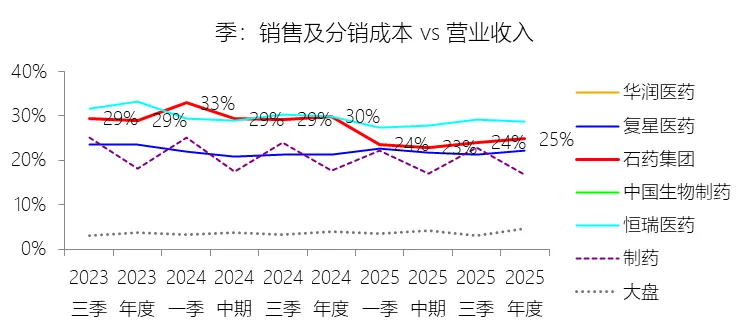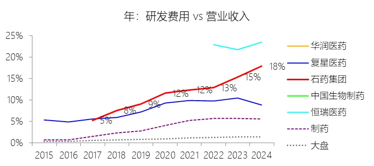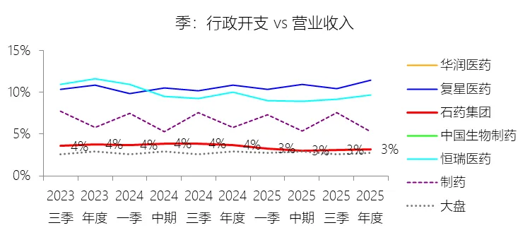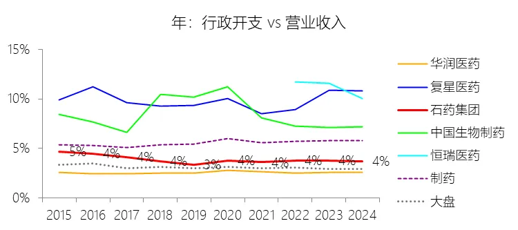 管理费用:2025年,石药集团的行政开支为8.25亿元,同比减少23.54%,与营业收入的比例为3.17%(管理费用率),同比下降0.55个百分点;2015-2024年(十年),此项合计为82.83亿元,平均比例为3.81%,比制药行业的均值低1.81个百分点,长期呈下降趋势。