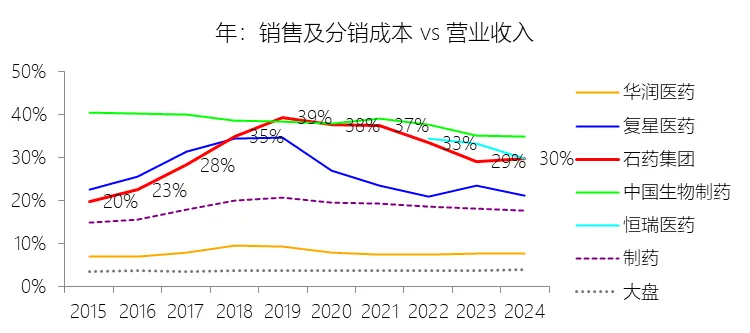 销售费用:2025年,石药集团的销售及分销成本为64.63亿元,同比减少25.39%,与营业收入的比例为24.85%(销售费用率),同比下降5.01个百分点;2015-2024年(十年),此项合计为709.08亿元,平均比例为32.59%,比制药行业的均值高14.08个百分点,长期呈上升趋势。比例短期下降主要由于石药集团核心成药产品多美素及津优力被纳入京津冀“3+N”等联盟药品的集中带量采购,中标价的大幅下调使得相关产品的销售及推广需求相应减少,导致2025年销售及分销成本出现显著回落;同时,集团在外部环境承压下积极加强费用管控,优化营销活动效率,使得行政及销售开支占收入的比率有所降低。比例长期上升主要由于集团自2012年起坚定实施向创新药驱动的战略转型,为孵育恩必普、多美素、津优力、克艾力等重磅创新药集群,持续大规模扩充专业销售团队(总人数超万人)并加强医学事务及学术推广投入;加之国家“两票制”政策的推行,集团将业务模式由传统的渠道分销转为高成本的自营销售模式,且随着创新产品加速进入医保及临床应用,相应的市场开拓、渠道下沉及品牌推广力度逐年加大,从而推高了整体销售费用率。比例高于制药行业的均值主要由于石药集团构建了极其强大的商业化体系,其逾万人的专业营销团队广泛覆盖全国30个省份的三万余家医疗机构,包括大量一终端(等级医院)、二终端(零售药店)及三终端(基层医疗机构),这种以学术推广为核心、追求高渗透率的创新药营运模式,较行业内侧重于仿制药或原料药的企业具有更高的销售开支强度;同时,集团通过持续的高投入成功打造了多款在神经系统、抗肿瘤等领域占据领先地位的重磅品种,为维持这些核心产品的市场主导地位并承接源源不断上市的新药,集团必须保持显著优于行业平均水平的销售投入水平。