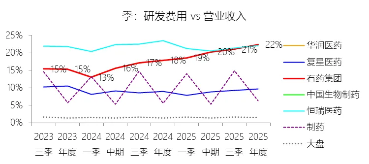 研发费用:2025年,石药集团的研发费用为58.09亿元,同比增长11.91%,与营业收入的比例为22.34%(研发费用率),同比上升4.44个百分点;2015-2024年(十年),此项合计为243.54亿元,平均比例为11.19%,比制药行业的均值高7.19个百分点,长期呈上升趋势。