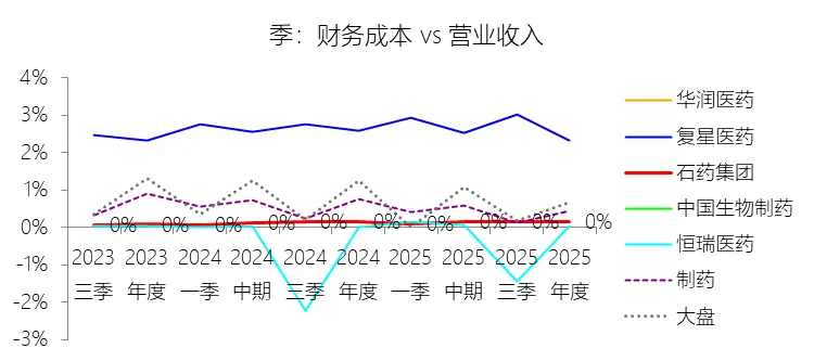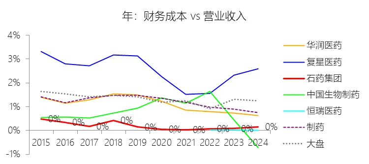 财务费用:2025年,石药集团的财务成本为0.39亿元,同比减少11.63%,与营业收入的比例为0.15%,同比略微下降;2015-2024年(十年),此项合计为3.28亿元,平均比例为0.15%,比制药行业的均值低1个百分点,长期呈下降趋势。