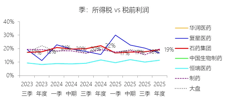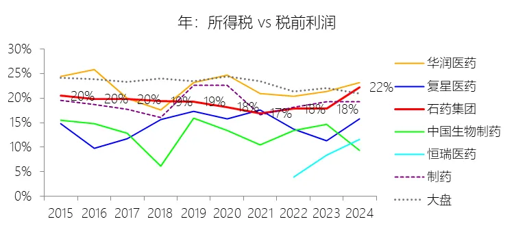 所得税率:2025年,石药集团的所得税为9.32亿元,同比减少24.85%,与税前利润的比例为19.38%(所得税率),同比下降2.85个百分点;2015-2024年(十年),此项合计为92.56亿元,平均比例为18.80%,比制药行业的均值低0.08个百分点,长期呈下降趋势。