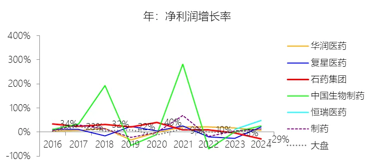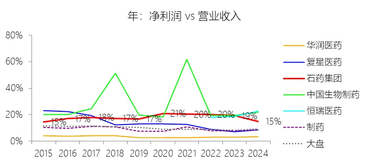 营业收入增长率:2025年,石药集团的营业收入为260.06亿元,同比减少10.35%,增速同比下降2.59个百分点;2015-2024年(九年)增长203.91%,年复合增长13.15%,比制药行业的复合增速高2.34个百分点,长期呈下降趋势。增速短期下降主要由于石药集团核心成药产品多美素及津优力被纳入京津冀“3+N”等联盟药品的集中带量采购,导致中标价大幅下调(如津优力价格下调约58%,多美素下调约23%),且主力创新药恩必普受国家医保谈判降价影响,使得抗肿瘤和神经系统等核心治疗领域的收入出现阶段性的大幅下滑。增速长期下降主要由于中国医药行业监管及政策环境的持续演变,包括医药行业进入“新常态”后的增速放缓、仿制药一致性评价的全面推进、多轮国家集采引致普药和到期专利药的价格大幅侵蚀,以及“限抗令”和辅助用药监控对传统优势品种的增长制约,加之集团营收基数在十年间增长超两倍后,高基数效应导致增速自然呈回落趋势。增速高于制药行业的复合增速主要由于石药集团在研发领域具有深厚积淀,其研发投入强度长期显著高于行业平均水平(如2025年研发费用率达22.34%),并成功孵育出恩必普、多美素、津优力、克艾力等重磅创新药集群,推动成药业务占比及盈利能力持续提升。同时,集团凭借“原料药+制剂”全产业链的低成本管控优势、覆盖全国逾35,000家医疗机构的强大商业化团队、以及近年来在国际化BD授权领域取得的突破性进展(如2025年授权费收入显著贡献),确保了其核心竞争力及整体增长动能持续强于行业平均水平。