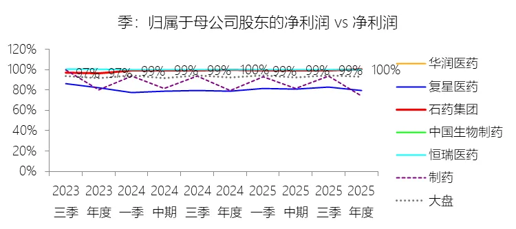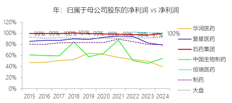 归属于母公司股东的净利润:2025年,石药集团的归属于母公司股东的净利润为38.82亿元,同比减少10.3%,与净利润的比例为100.15%,同比上升0.4个百分点;2015-2024年(十年),此项合计为394.43亿元,平均比例为98.67%,比制药行业的均值高15.88个百分点,长期呈下降趋势。
