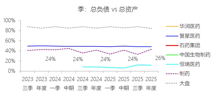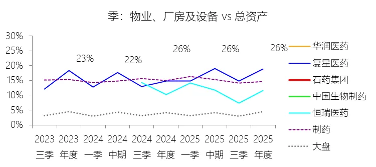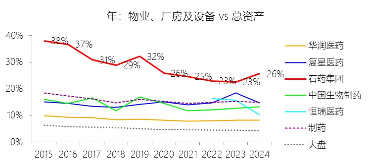 物业、厂房及设备:2025年末,石药集团的物业、厂房及设备为121.53亿元,对比年初增长6.85%,与总资产的比例为26.03%,同比上升0.4个百分点;2015-2024年(十年),此项与总资产的平均比例为26.80%,比制药行业的均值高11.35个百分点,长期呈下降趋势。
