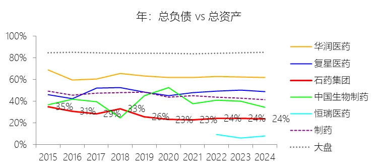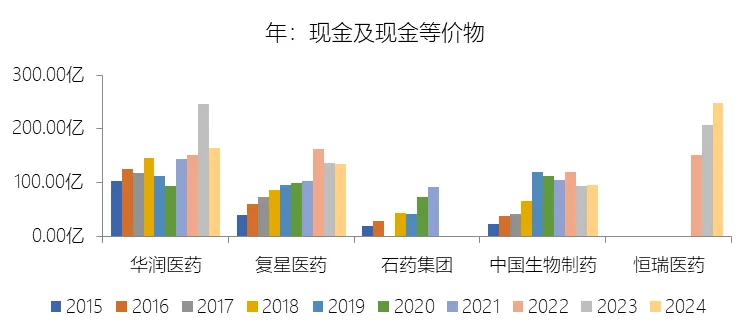 现金及现金等价物:2024年末,石药集团的现金及现金等价物缺数据,与总资产的比例无效;2015-2024年(十年),此项与总资产的平均比例为10.32%,比制药行业的均值低6.66个百分点,长期呈上升趋势。