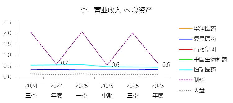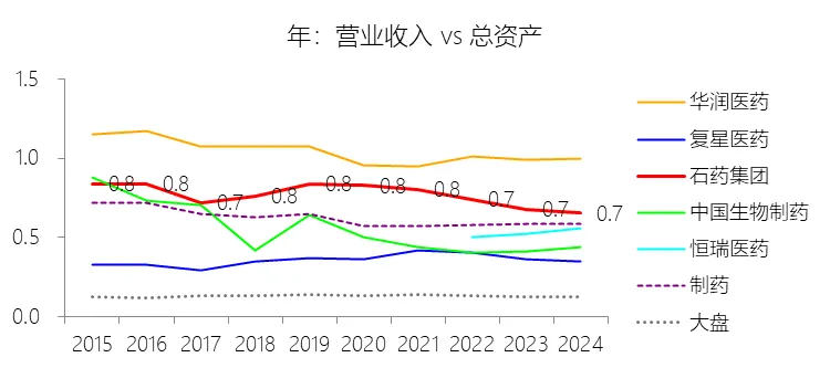 总资产周转率:2025年,石药集团的总资产周转率为0.6次,同比下降0.1次;2015-2024年(十年),平均总资产周转率为0.8次,比制药行业的均值高0.14次,长期呈下降趋势。