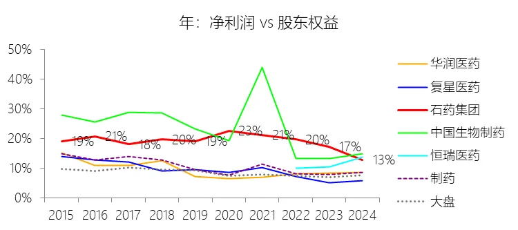 净利率:2025年,石药集团的净利润为38.76亿元,同比减少10.66%,与营业收入的比例为14.91%(净利率),同比下降0.05个百分点;2015-2024年(十年),此项合计为399.74亿元,平均比例为18.37%,比制药行业的均值高9.38个百分点,长期呈上升趋势。比例短期下降主要由于石药集团核心创新药产品如津优力、多美素在2024至2025年间因纳入京津冀“3+N”联盟等药品集中带量采购导致价格大幅下调,且主力产品恩必普受国家医保谈判降价影响,导致抗肿瘤和神经系统等核心业务收入及毛利空间受到挤压。同时,集团在营收下滑的背景下持续加大研发投入,2025年研发费用率显著上升至22.34%,进一步摊薄了当期的净利率水平。比例长期上升主要由于石药集团自2012年起坚定实施从普药及原料药向创新药转型的战略,通过持续的高强度研发投入,成功打造了恩必普、津优力、多美素、克艾力等重磅创新药集群,使得高利润率的成药业务占比从2015年的33.1%提升至近年来的约60%甚至更高,大幅改善了集团的盈利结构。此外,集团凭借“原料药+制剂”全产业链的低成本管控优势,使得其十年平均营业成本率远低于行业均值,为长期盈利能力的提升奠定了基础。比例高于制药行业的均值主要由于集团在创新药研发领域起步早、积淀深,率先推出了国内卒中领域首个一类新药及全球首个米托蒽醌纳米药物,构建了具有较强的定价权和市场壁垒的产品组合。同时,集团依托覆盖全国逾35,000家医疗机构的强大商业化团队,实现了创新产品的快速放量和极高的市场渗透率。近年来,集团在国际化BD领域取得显著突破,如2025年取得的多项重磅对外授权业务贡献了高毛利的授权费收入,使其整体盈利水平在行业调整期内依然保持显著领先。