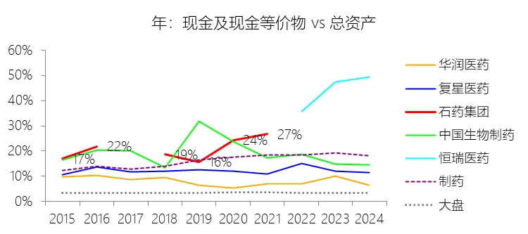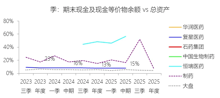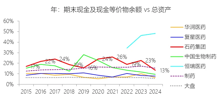 期末现金及现金等价物余额:2025年末,石药集团的期末现金及现金等价物余额缺数据,与总资产的比例无效;2015-2024年(十年),此项与总资产的平均比例为20.16%,比制药行业的均值高4.59个百分点,长期呈下降趋势。