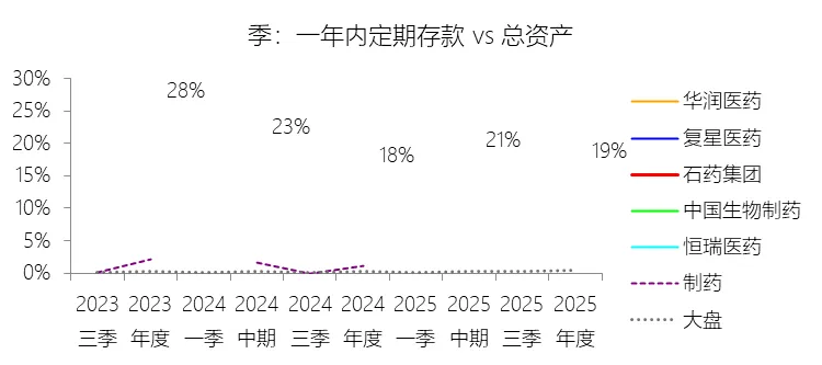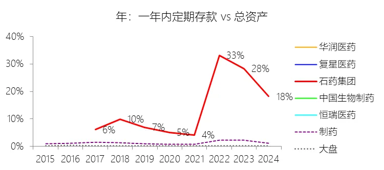 一年内定期存款:2025年末,石药集团的一年内定期存款为88.65亿元,对比年初增长9.66%,与总资产的比例为18.98%,同比上升0.77个百分点;2015-2024年(十年),此项与总资产的平均比例为14.95%,比制药行业的均值高13.56个百分点,长期呈上升趋势。