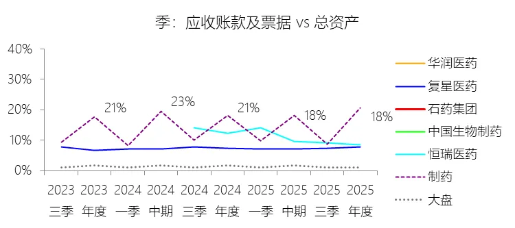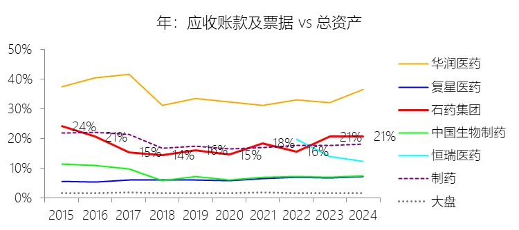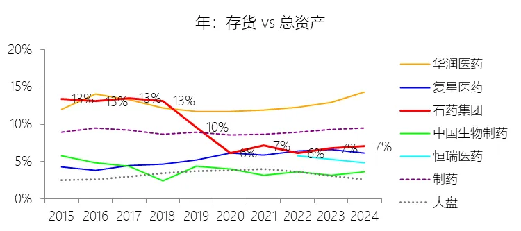 应收账款及票据:2025年末,石药集团的应收账款及票据为83.60亿元,对比年初减少9.09%,与总资产的比例为17.90%,同比下降2.82个百分点;2015-2024年(十年),此项与总资产的平均比例为17.96%,比制药行业的均值低0.21个百分点,长期呈下降趋势。