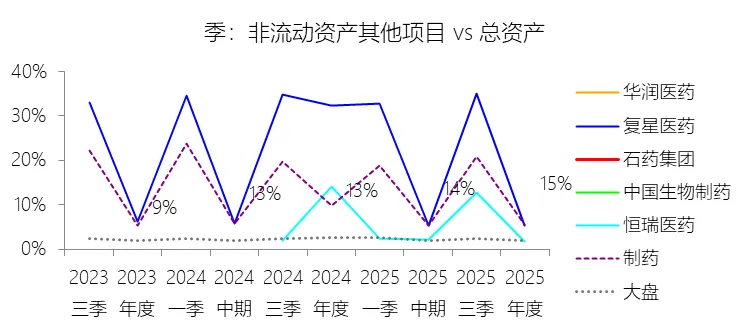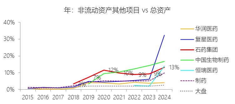 非流动资产其他项目:2025年末,石药集团的非流动资产其他项目为69.79亿元,对比年初增长18.84%,与总资产的比例为14.95%,同比上升1.72个百分点;2015-2024年(十年),此项与总资产的平均比例为8.12%,比制药行业的均值高3.25个百分点,长期呈上升趋势。此项大部分对应原报表的银行存款、其他金融资产,少部分为使用权资产。比例短期上升主要由于石药集团在2025年大幅增加了非流动性质的银行存款配置,该项金额从年初的24.10亿元增至年末的33.92亿元,同时使用权资产也因业务扩张和新租赁协议的确认从年初的11.28亿元增长至13.36亿元,使得该项目的整体增速(18.84%)显著快于同期总资产的扩张速度(5.2%)。比例長期上升主要由于集团自2018年起开始大量配置到期日在一年以上的定期存款以优化闲置资金收益,并持续通过合伙企业及基金在医疗健康领域开展战略性股权投资,加之2019年起根据新会计准则引入使用权资产科目,共同驱动了该项资产规模及其在总资产中占比的快速累积。比例高于制药行业的均值主要由于石药集团凭借恩必普等重磅创新药集群构建了极强的自我造血能力,其经营活动现金流长期稳健且充沛(十年均值显著高于行业),使其在维持高额研发投入和资本开支之余,仍拥有远超行业平均水平的富余资金进行长期银行存款配置和金融资产投资;与行业内多数现金流相对偏紧或资产结构更偏重于厂房设备的药企相比,石药极其稳健的“现金奶牛”属性和向创投领域延伸的资产布局,显著拉高了该项目在总资产中的占比。