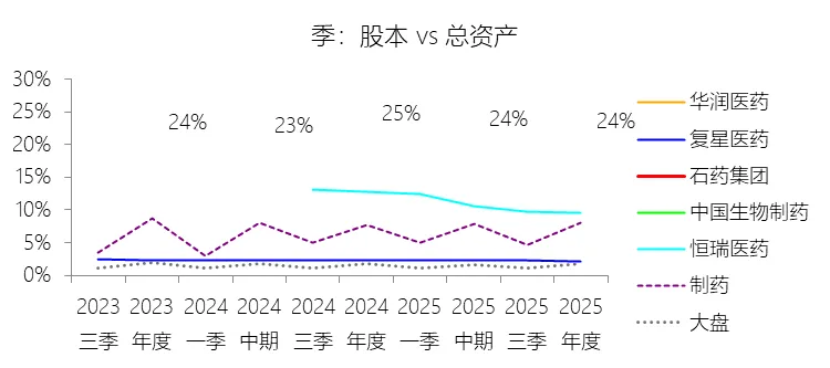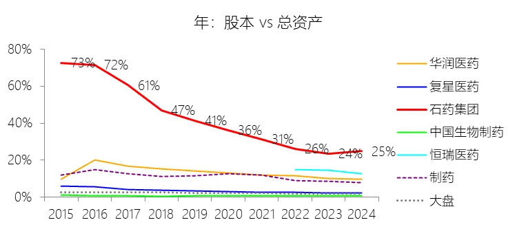 股本:2025年末,石药集团的股本为110.61亿元,对比年初增长0.26%,与总资产的比例为23.69%,同比下降1.17个百分点;2015-2024年(十年),此项与总资产的平均比例为36.30%,比制药行业的均值高25.66个百分点,长期呈下降趋势。