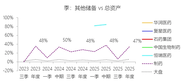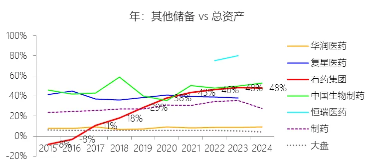 其他储备:2025年末,石药集团的其他储备为221.17亿元,对比年初增长4.17%,与总资产的比例为47.36%,同比下降0.47个百分点;2015-2024年(十年),此项与总资产的平均比例为35.13%,比制药行业的均值高5.25个百分点,长期呈上升趋势。