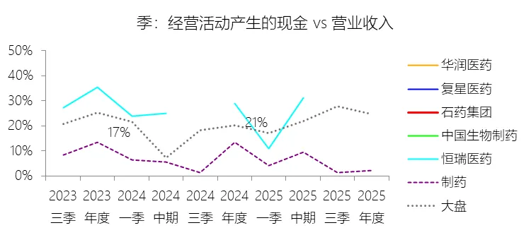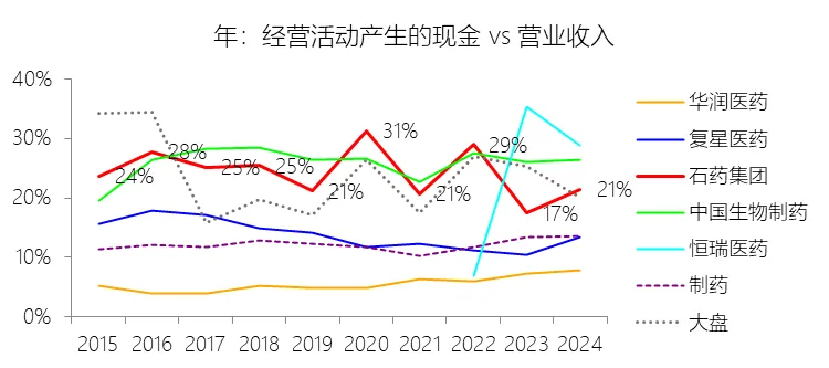 经营活动产生的现金:2025年,石药集团的经营活动产生的现金缺数据,与营业收入的比例无效;2015-2024年(十年),此项合计为520.26元,平均比例为23.91%,比制药行业的均值高11.68个百分点,长期呈下降趋势。