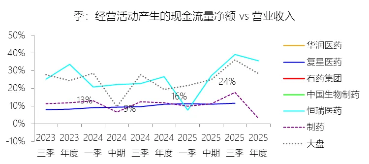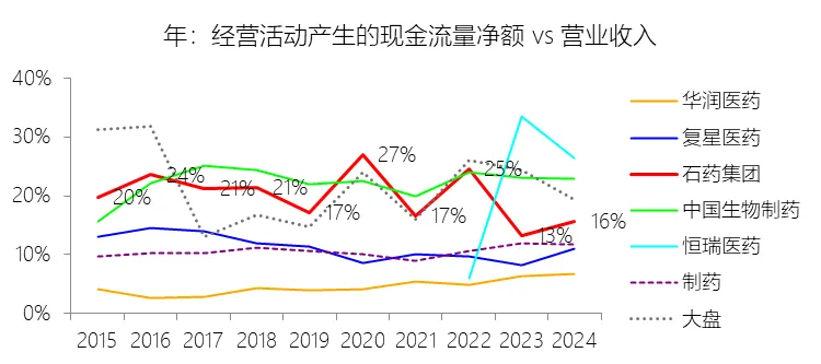 经营活动产生的现金流量净额:2025年,石药集团的经营活动产生的现金流量净额缺数据,与营业收入的比例无效;2015-2024年(十年),此项合计为425.38元,平均比例为19.55%,比制药行业的均值高8.84个百分点,长期呈下降趋势。