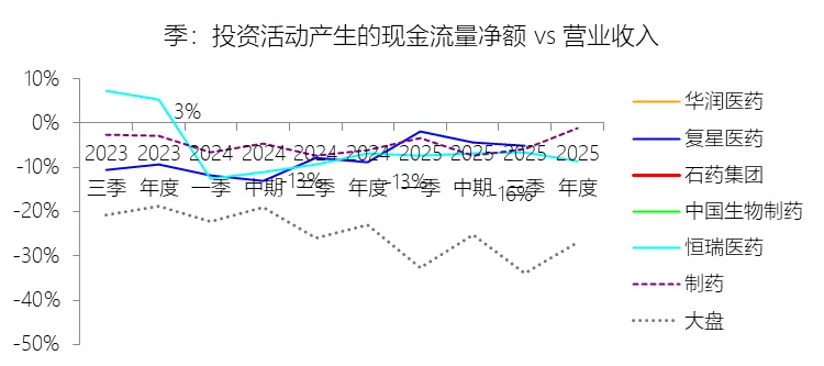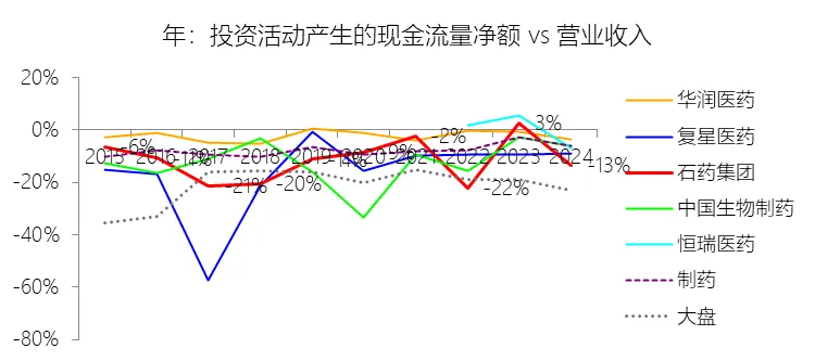投资活动产生的现金流量净额:2025年,石药集团的投资活动产生的现金流量净额缺数据,与营业收入的比例无效;2015-2024年(十年),此项合计为-231.81元,平均比例为-10.66%,比制药行业的均值低3.38个百分点,长期呈上升趋势。