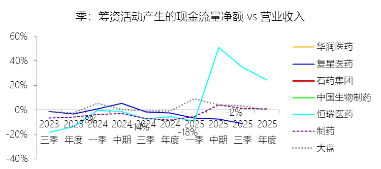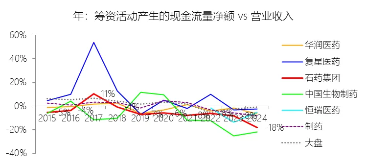 筹资活动产生的现金流量净额:2025年,石药集团的筹资活动产生的现金流量净额缺数据,与营业收入的比例无效;2015-2024年(十年),此项合计为-146.22元,平均比例为-6.72%,比制药行业的均值低5.64个百分点,长期呈下降趋势。