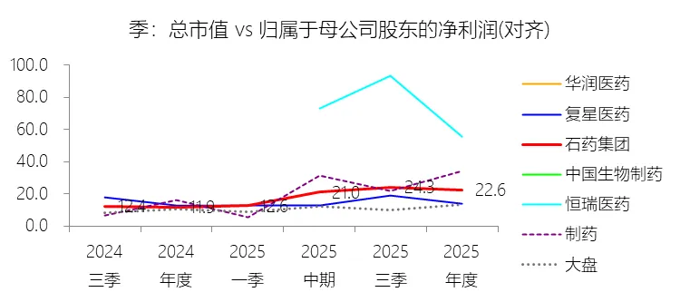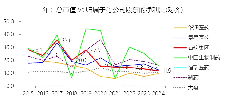 市盈率:2025年,石药集团的归属于母公司股东的净利润(对齐)为38.82亿元,对比年初减少10.3%,总市值与归属于母公司股东的净利润(对齐)的比例为22.6倍(市盈率),对比年初上升10.7个倍数;2015-2024年(十年),此项合计为394.43亿元,平均比例为18.0倍,比制药行业的均值低2.86个倍数,长期呈下降趋势。