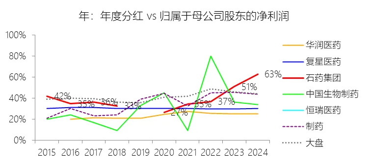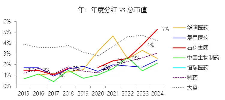 股息率:2024年,石药集团的股息率为5.29%,同比上升1.45个百分点;2015-2024年(十年),平均股息率为2.02%,比制药行业的均值高0.19个百分点,长期呈上升趋势。