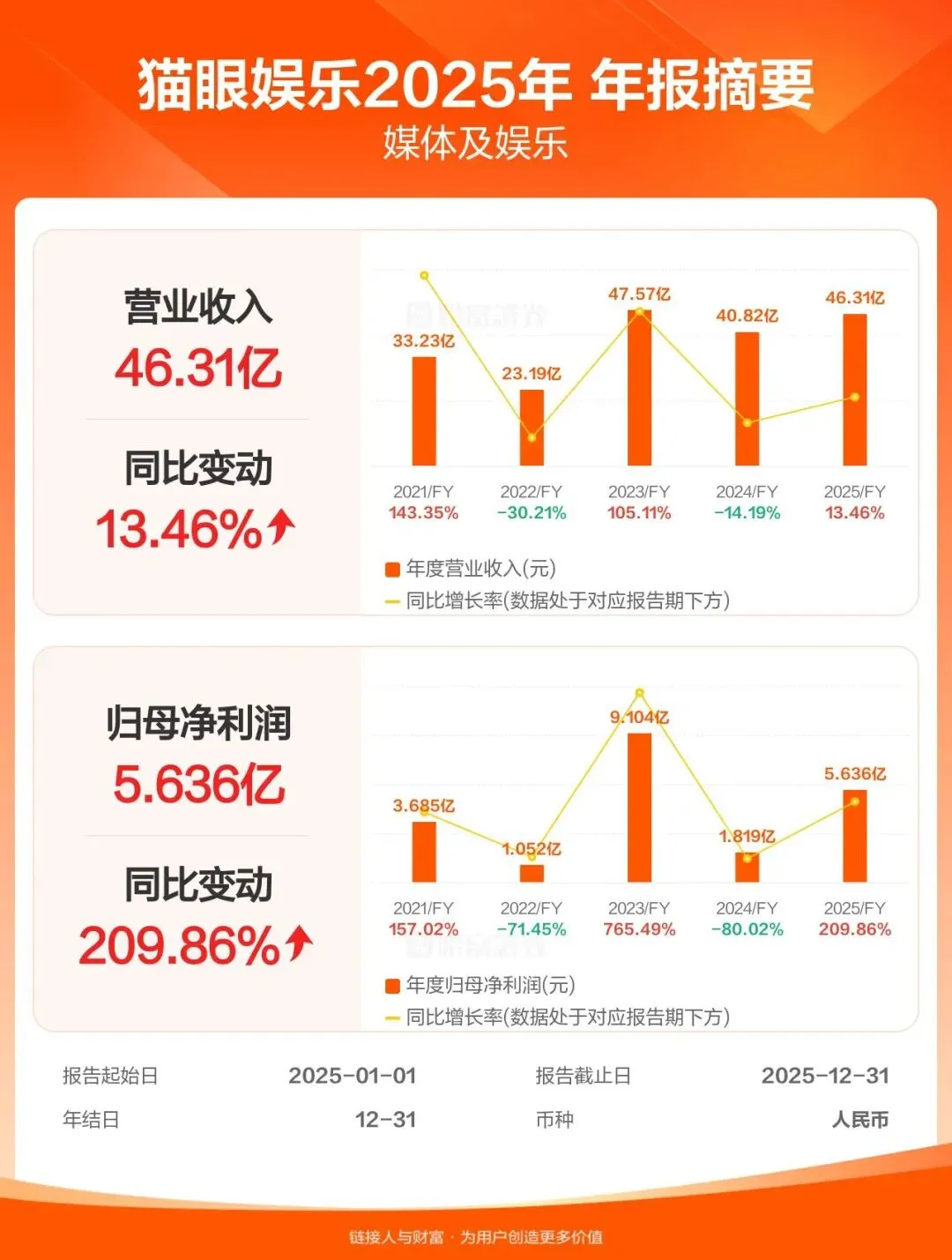 3月26日,猫眼娱乐(股票代号:01896.HK)发布2025年全年业绩公告。公告显示,公司2025年总收入达46.31亿元,同比增长13.5%;净利润5.63亿元,同比激增209.6%;期内经调整净利润6.77亿元,同比增长118.7%,核心盈利指标表现亮眼。