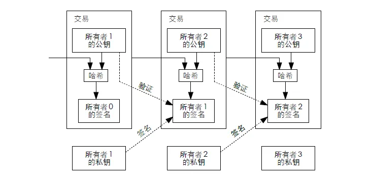 中本聪说,我们定义电子货币是一条数字签名链,每个拥有者都通过将上一次交易和下一个拥有者公钥哈希值的数字签名,添加到此货币末尾的方式,将这枚货币转移给下一个拥有者。收款人可以通过验证数字签名来证实,他是这条链的所有者。