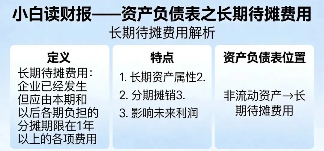 长期待摊费用 = 已经花掉、慢慢摊销的“虚资产”越少越好,摊销越短越好,能直接费用化最优秀。若觉得文章有帮助到你,点赞关注,会不定期分享干货,点击名片即可关注:作者提示:以上内容仅是个人观点,不构成投资建议。股市有风险,投资需谨慎。