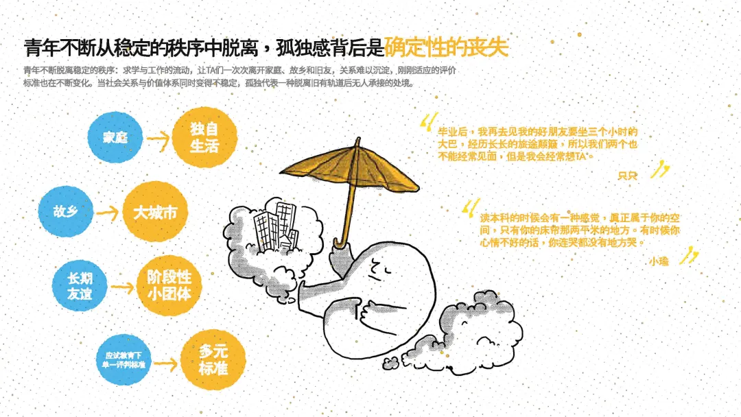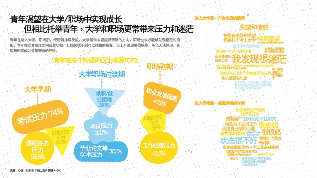 《2026青年情绪百皮书》通过问卷调查、深度访谈等方法研究 18-35 岁青年情绪现状,指出焦虑、孤独成为青年时代情绪底色,97.0% 青年能感知身边压力、62.8% 处于中高压力,情绪困扰源于未来不确定、竞争激烈等多维度,且存在显著性别、阶段差异;青年平均尝试6.5 种方式应对情绪,关系支持为主要手段,专业心理服务使用率仅7.4%,同时青年正通过自助、互助重构心理支持系统,衍生出六大生命力人格,而未来青年情绪支持将走向脆弱叙事日常化、AI 心理自助普及、关系互助网络兴起三大趋势,整体对现有应对方式满意度仅 3.3/5 分,期待个性化、能解决现实问题的情绪支持方案。直接戳“阅读原文”下载