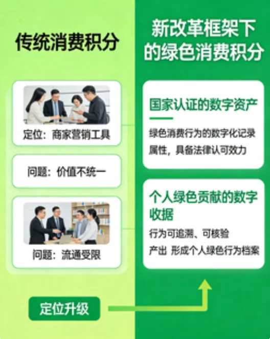长期以来,消费积分多作为商家吸引消费者复购的营销手段,存在价值不统一、流通受限等问题。在新的改革框架下,绿色消费积分的定位将全面升级,具备两大全新属性。