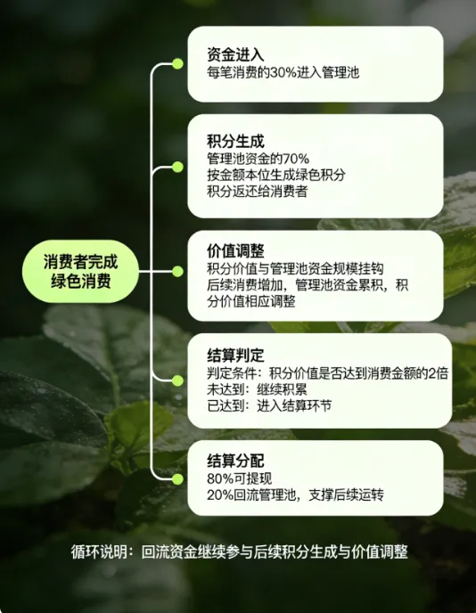 积分铸造逻辑:管理池资金的70%按金额本位铸造绿色积分,返还给消费者。