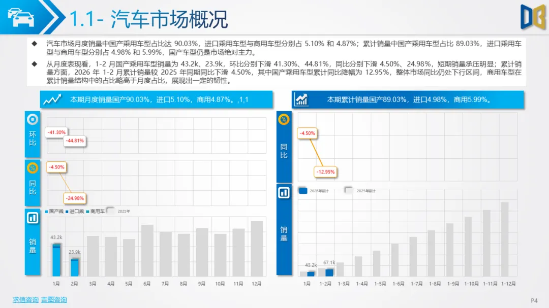 2026年1-2月,北京市汽车市场受春节季节性因素及需求复苏滞后影响,整体呈现 “国产主导、全面承压、结构分化” 的核心特征,各细分市场均面临不同程度的短期回调压力。