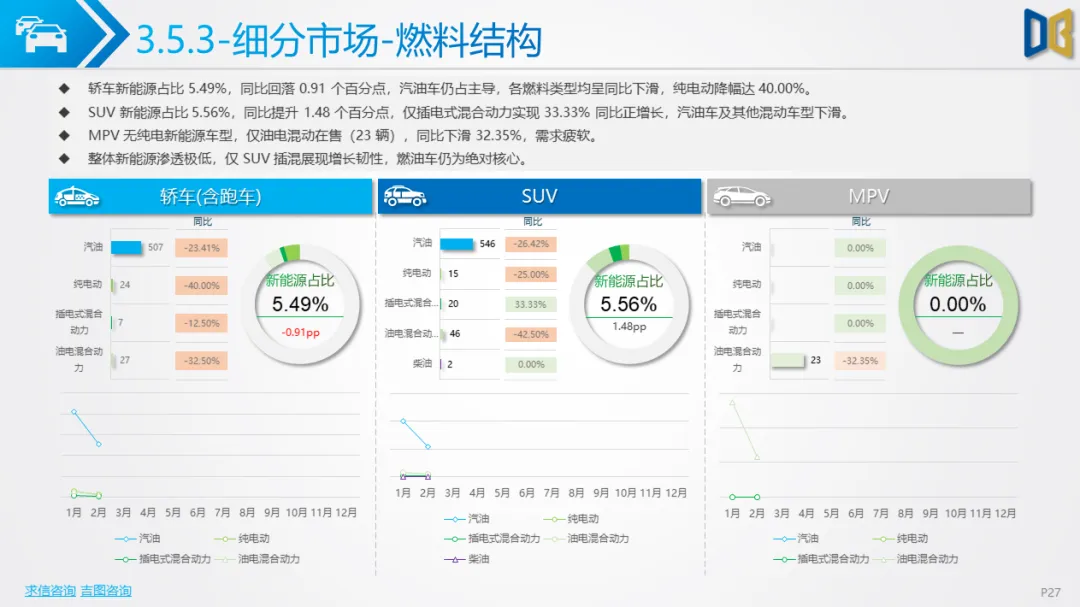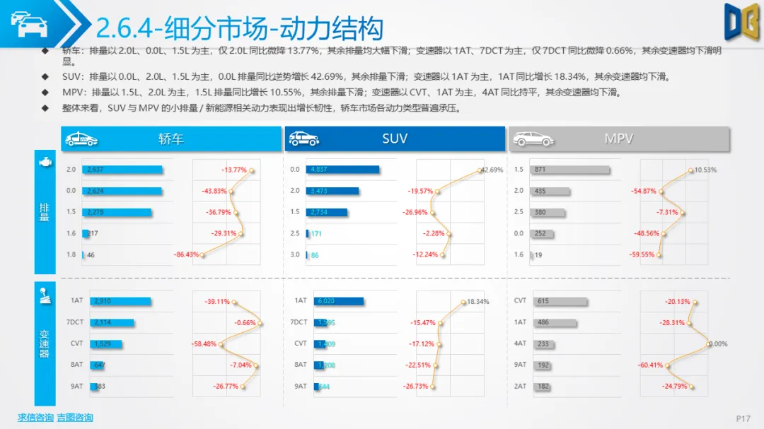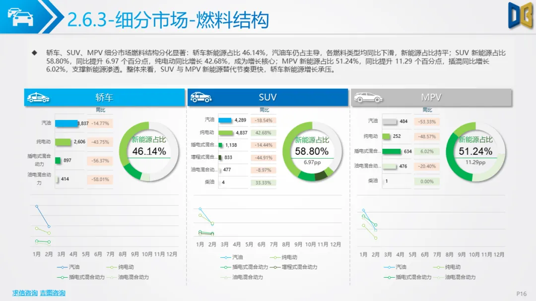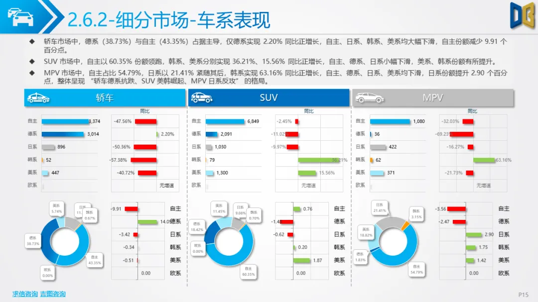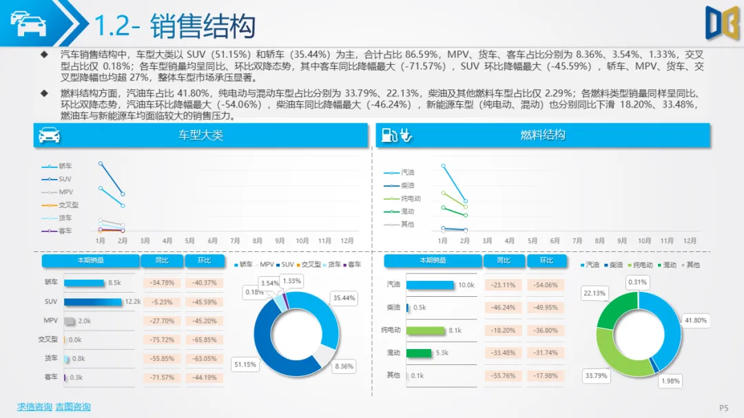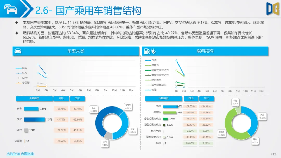 国产乘用车市场短期承压明显,1-2月销量分别为38,258辆、21,484辆,环比跌幅均超43%,1-2月累计销量同比下滑11.74%,呈现 “月度大幅下滑、累计小幅承压” 的态势。动力总成方面,2.0L 与 1.5L排量合计占比超五成,AT 系变速器占比43.83%居首,仅1AT、7DCT等少数类型实现增长。企业竞争格局呈现 “头部合资稳定、自主与新势力内部分化” 特征,TOP20 车企合计占据82.16%市场份额,一汽-大众、上汽大众、比亚迪稳居前三,理想、赛力斯等实现同比正增长,比亚迪、吉利等则同比下滑。车系方面,自主品牌以53.65%份额主导,蔚来等新势力表现亮眼,但比亚迪等传统自主车企下滑明显;德系以24.31%份额紧随其后,合资品牌内部竞争加剧。销售结构上,SUV以53.89%占比成为核心,新能源占比首次超过燃油车达53.34%,但各类车型及燃料类型普遍下滑,仅柴油车同比增长。细分市场呈现 “轿车德系抗跌、SUV美韩崛起、MPV日系反攻” 的格局,消费升级趋势显著,轿车 B 级、SUV中大型、MPV C 级车型表现突出。