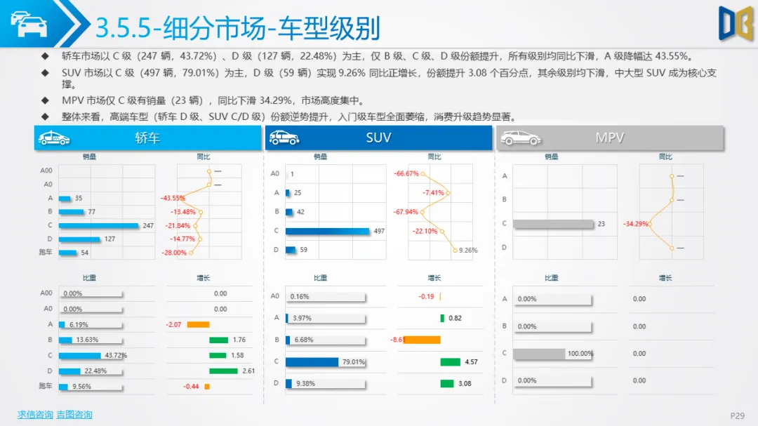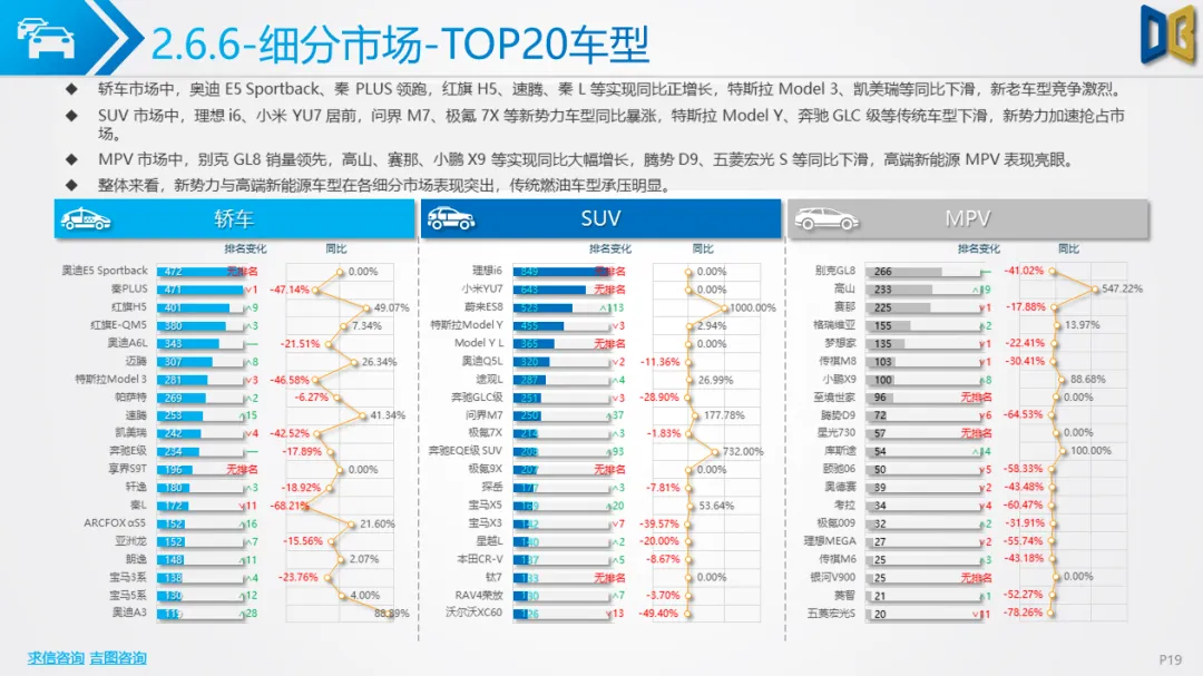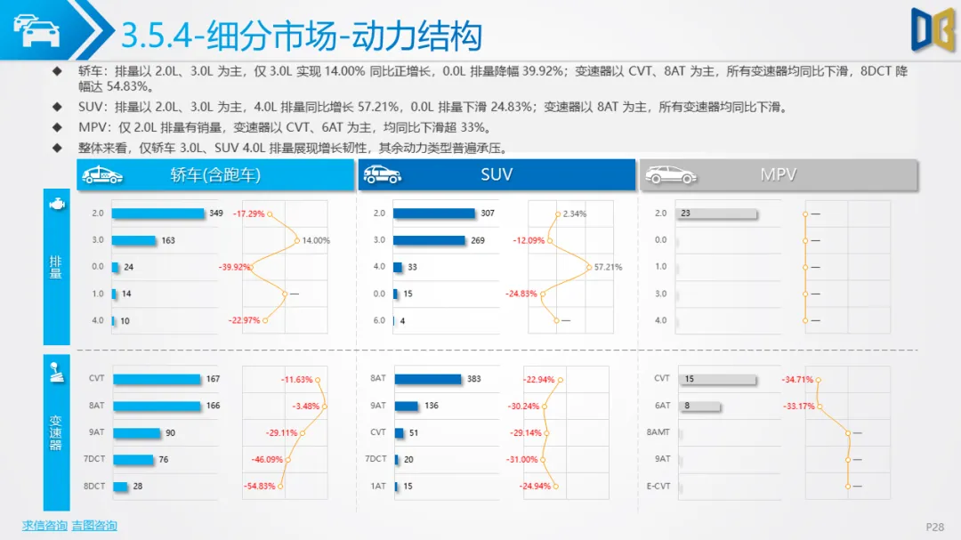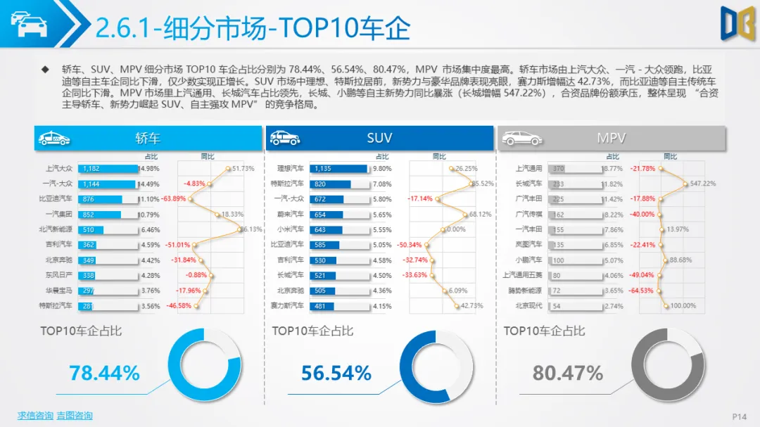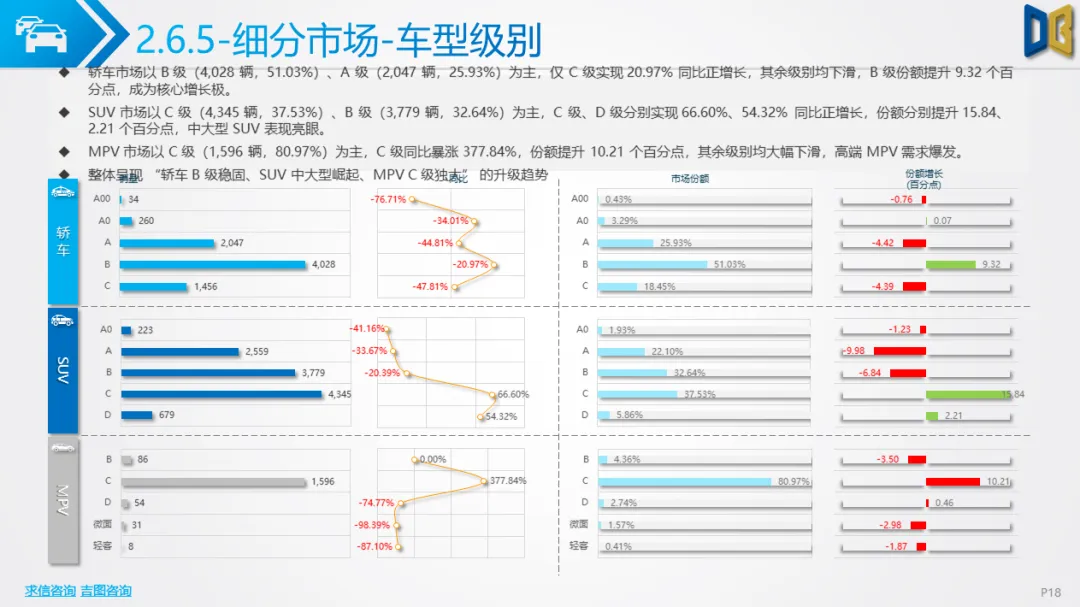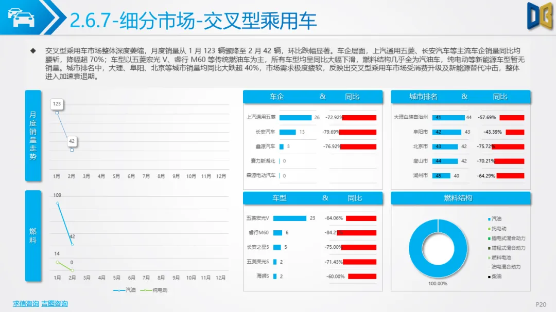 国产乘用车市场短期承压明显,1-2月销量分别为38,258辆、21,484辆,环比跌幅均超43%,1-2月累计销量同比下滑11.74%,呈现 “月度大幅下滑、累计小幅承压” 的态势。动力总成方面,2.0L 与 1.5L排量合计占比超五成,AT 系变速器占比43.83%居首,仅1AT、7DCT等少数类型实现增长。企业竞争格局呈现 “头部合资稳定、自主与新势力内部分化” 特征,TOP20 车企合计占据82.16%市场份额,一汽-大众、上汽大众、比亚迪稳居前三,理想、赛力斯等实现同比正增长,比亚迪、吉利等则同比下滑。车系方面,自主品牌以53.65%份额主导,蔚来等新势力表现亮眼,但比亚迪等传统自主车企下滑明显;德系以24.31%份额紧随其后,合资品牌内部竞争加剧。销售结构上,SUV以53.89%占比成为核心,新能源占比首次超过燃油车达53.34%,但各类车型及燃料类型普遍下滑,仅柴油车同比增长。细分市场呈现 “轿车德系抗跌、SUV美韩崛起、MPV日系反攻” 的格局,消费升级趋势显著,轿车 B 级、SUV中大型、MPV C 级车型表现突出。