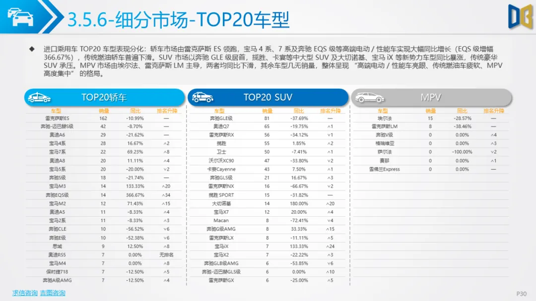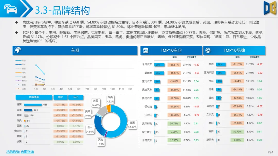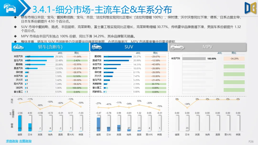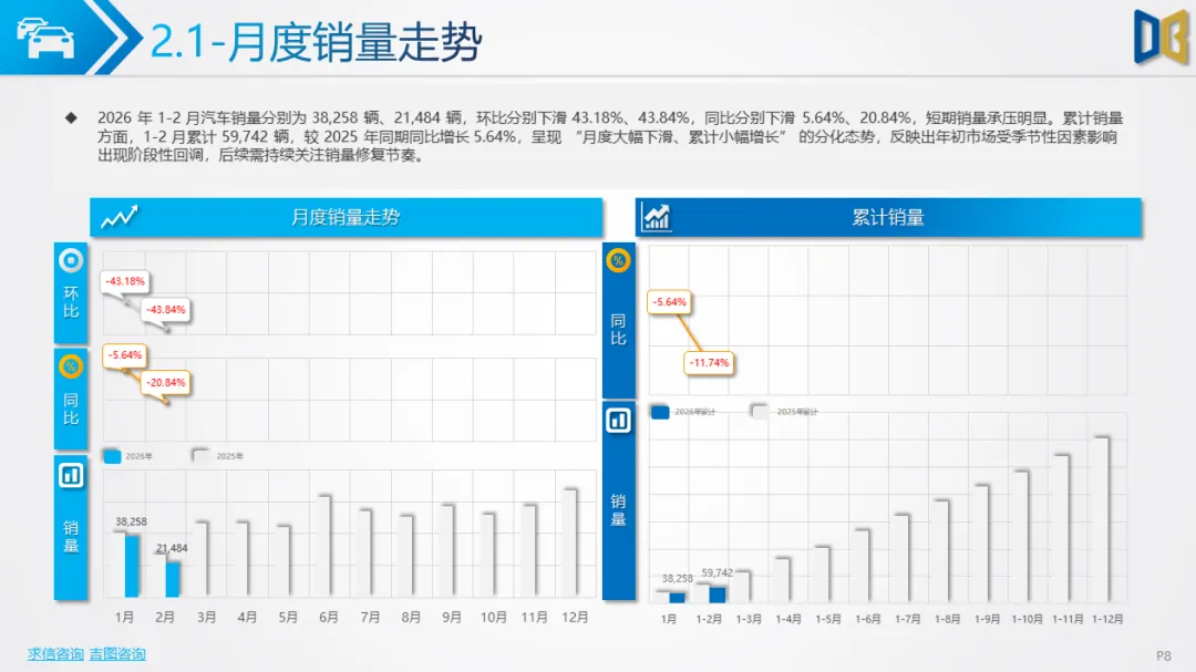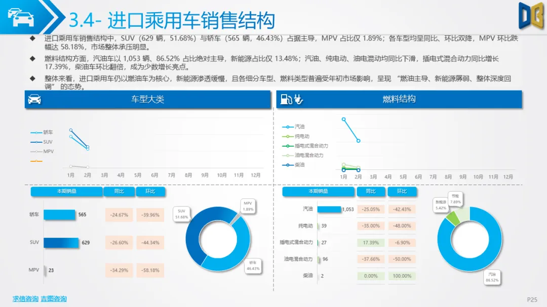 进口乘用车市场开局疲软,1-2月销量分别为2,126辆、1,217辆,环比跌幅逐步扩大至42.76%,1-2月累计销量同比下滑20.89%。动力总成以2.0L、3.0L排量和8AT变速器为主,仅4.0L排量、0.0L 1AT 等少数动力搭配实现正增长。品牌结构上,德系以54.89%份额绝对主导,日系紧随其后,丰田、戴姆勒、宝马位居车企前列,少数品牌逆势增长。销售结构中,SUV与轿车合计占比超98%,汽油车占比86.52%,新能源占比仅13.48%,渗透缓慢。细分市场中,高端电动/性能车表现亮眼,传统燃油车普遍疲软,消费升级趋势明显,轿车C/D级、SUV C/D 级等高端车型份额逆势提升。